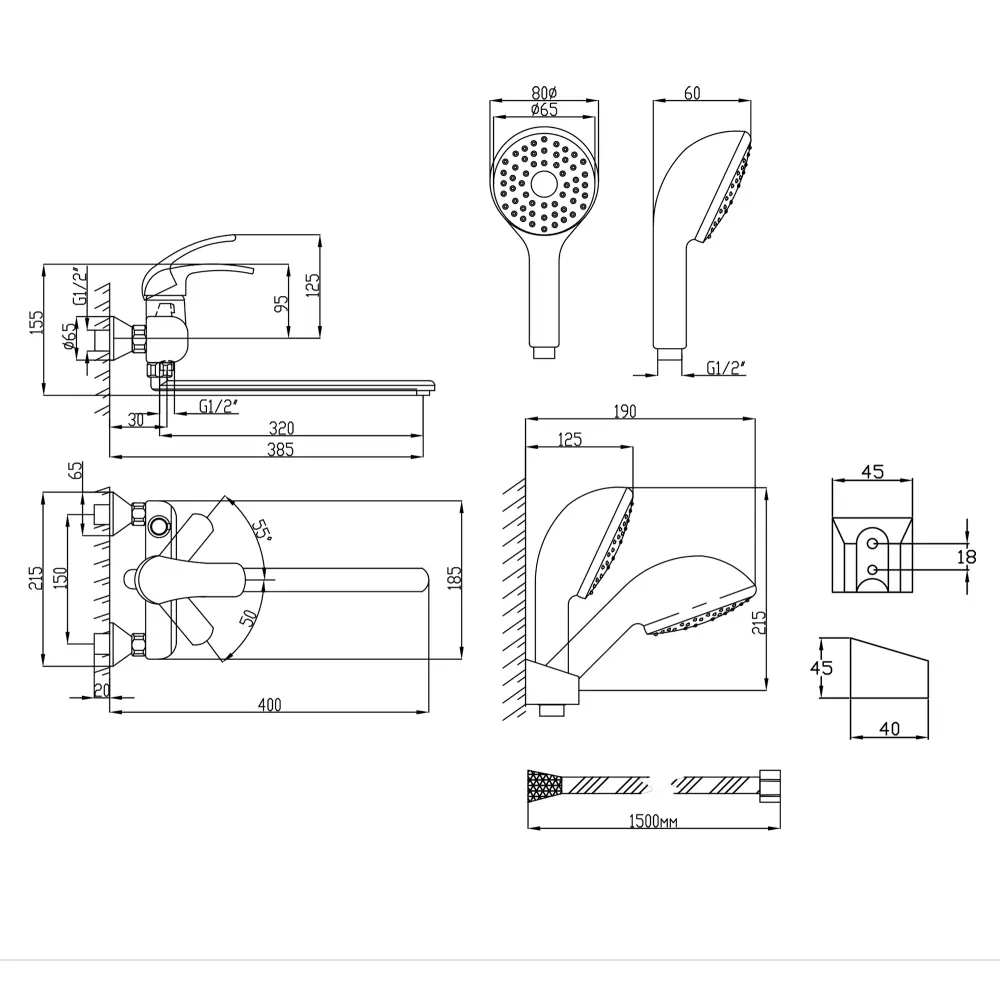 Змішувач, Лійка для ручного душу, Душовий шланг, Тримач для душу, Кріплення