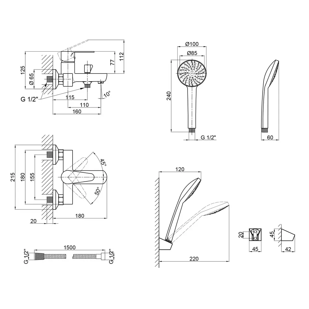 Змішувач, Кронштейн для ручного душу, Лійка для ручного душу, Душовий шланг, Кріплення