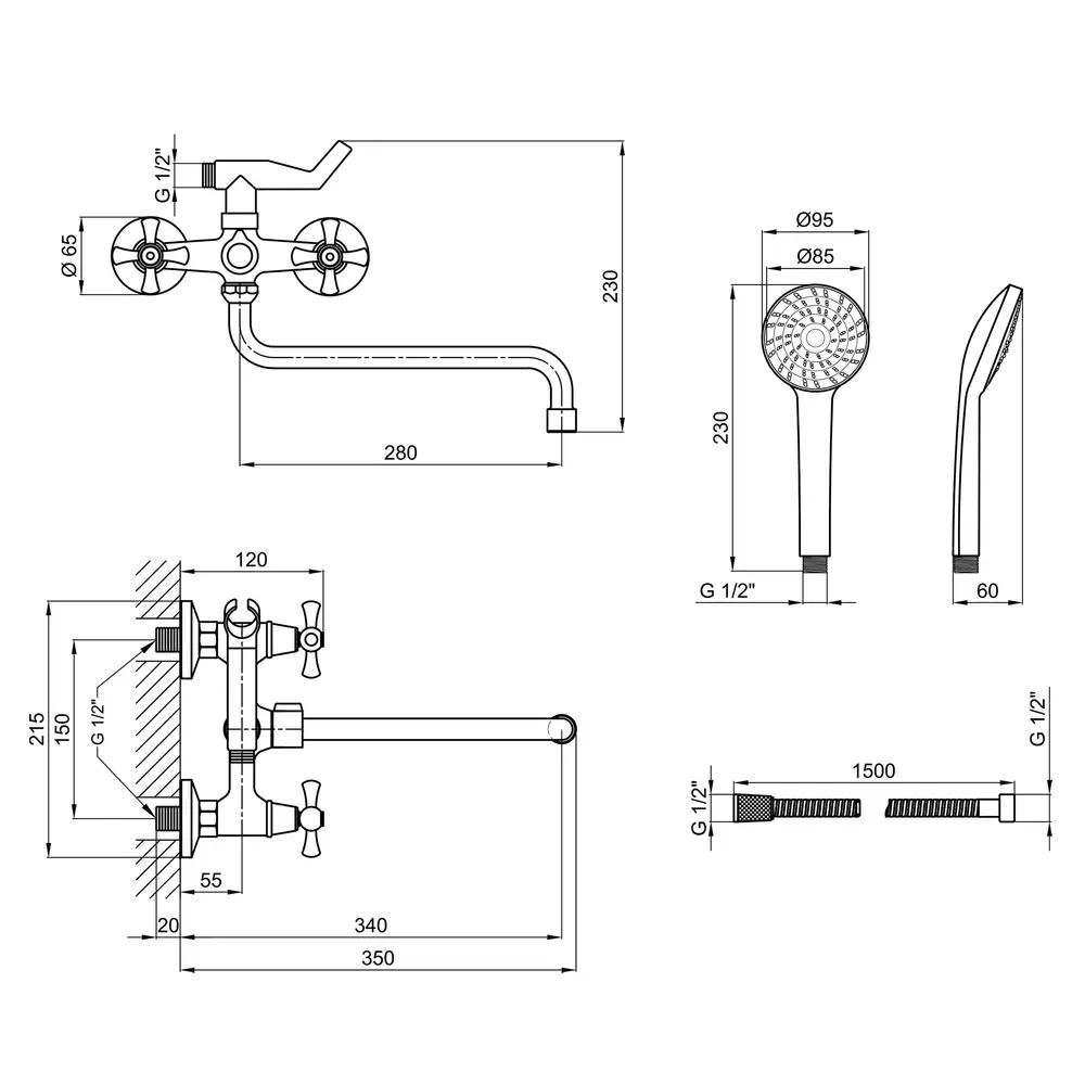 Змішувач, Душовий шланг, Лійка для ручного душу, Кріпильні деталі