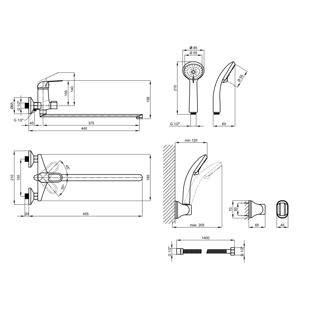 Змішувач, Душовий шланг, Лійка для ручного душу, Кріпильні деталі