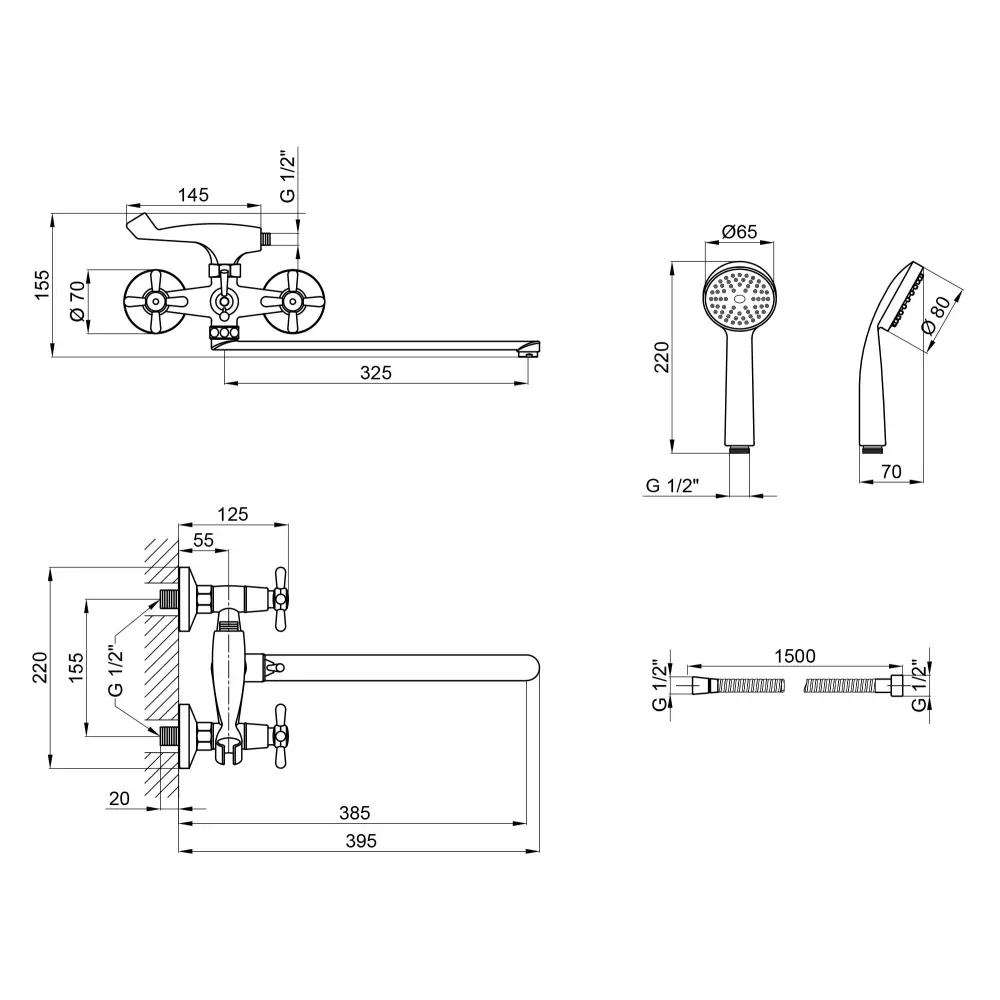 Змішувач, Душовий шланг, Лійка для ручного душу, Кріпильні деталі