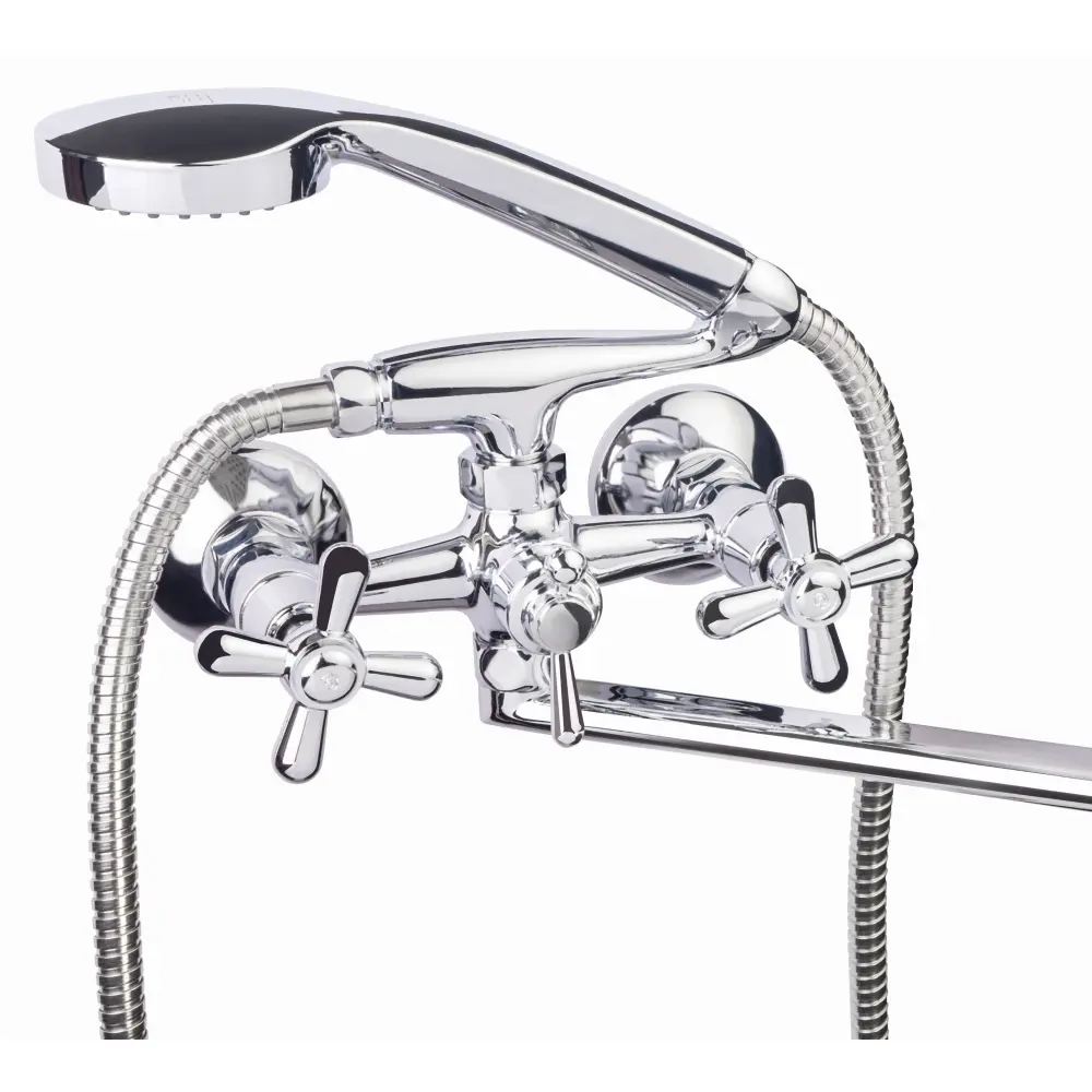 Змішувач для ванни Lidz (CRM) Dominox 15 143 з довгим поворотним виливом виготовлено з латуні, укомплектовано душовим шлангом і лійкою. Завдяки хромованому покриттю має міцну поверхню і привабливий зовнішній вигляд. Для включення потоку води передбачено два вентиля, для перемикання на душ - дивертор. Настінний монтаж здійснюється за допомогою кріпильних деталей, які входять в комплект. Декоративні розетки приховають всі погрішності установки на оздобленні ванної кімнати.