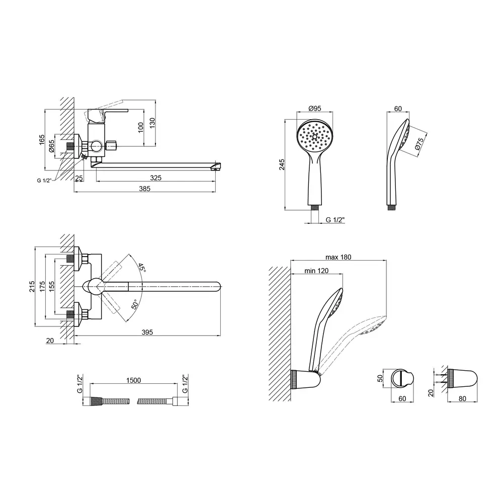 Змішувач, Душовий шланг, Лійка для ручного душу, Тримач для душу, Кріплення