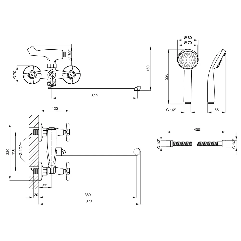 Змішувач, Лійка для ручного душу, Душовий шланг, Кронштейн для ручного душу, Кріплення