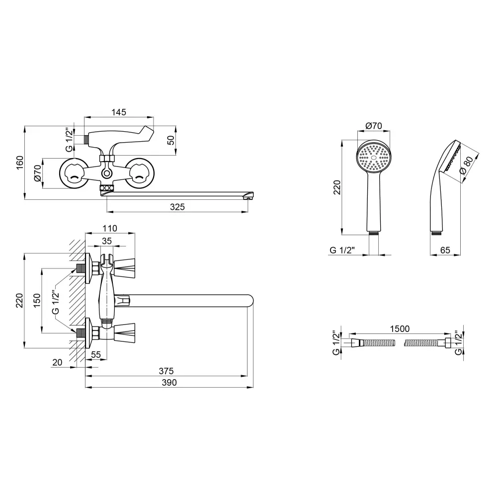 Змішувач, Душовий шланг, Лійка для ручного душу, Кріпильні деталі