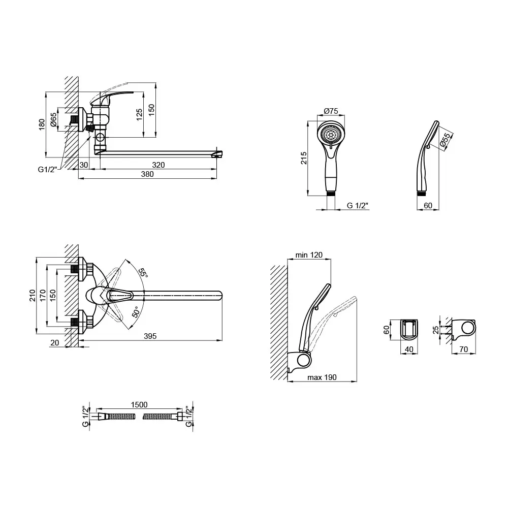 Змішувач, Душовий шланг, Лійка для ручного душу, Тримач для душу, Кріплення