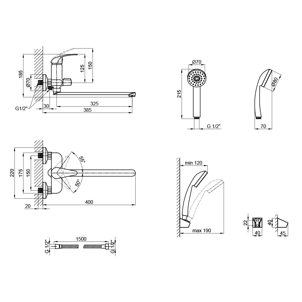 Змішувач, Душовий шланг, Лійка для ручного душу, Тримач для душу, Кріплення