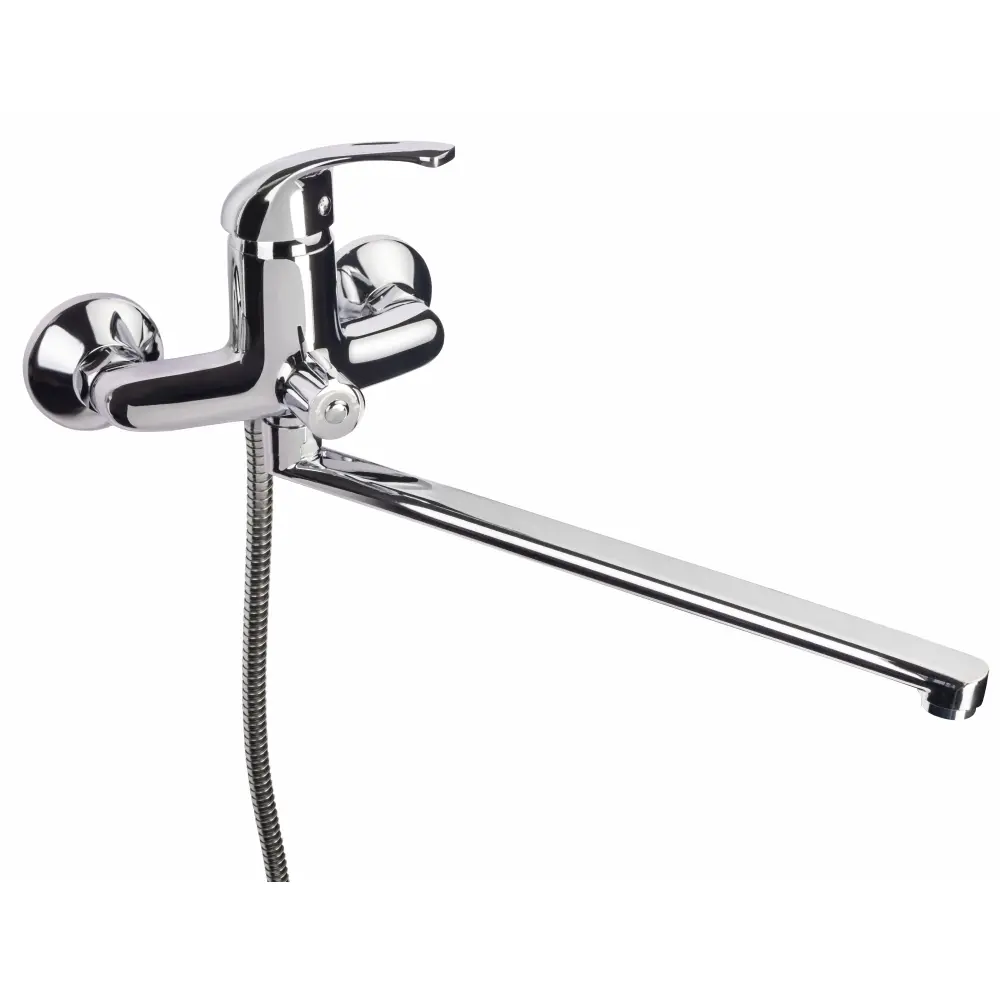 Змішувач для ванни Lidz (CRM) Premiera 84 005-1 з довгим поворотним виливом виготовлено з латуні, укомплектовано кронштейном для ручного душа, душових шлангом і лійкою. Завдяки хромованому покриттю має міцну поверхню і привабливий зовнішній вигляд. Декоративні розетки приховають похибки установки на обробці кімнати. Напір води і її температура регулюються поворотом важеля в необхідне положення. Перемикання ванна/душ здійснюється за допомогою дивертора.