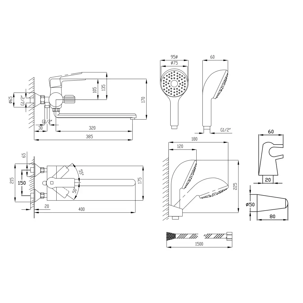 Змішувач, Душовий шланг, Лійка для ручного душу, Тримач для душу, Кріплення