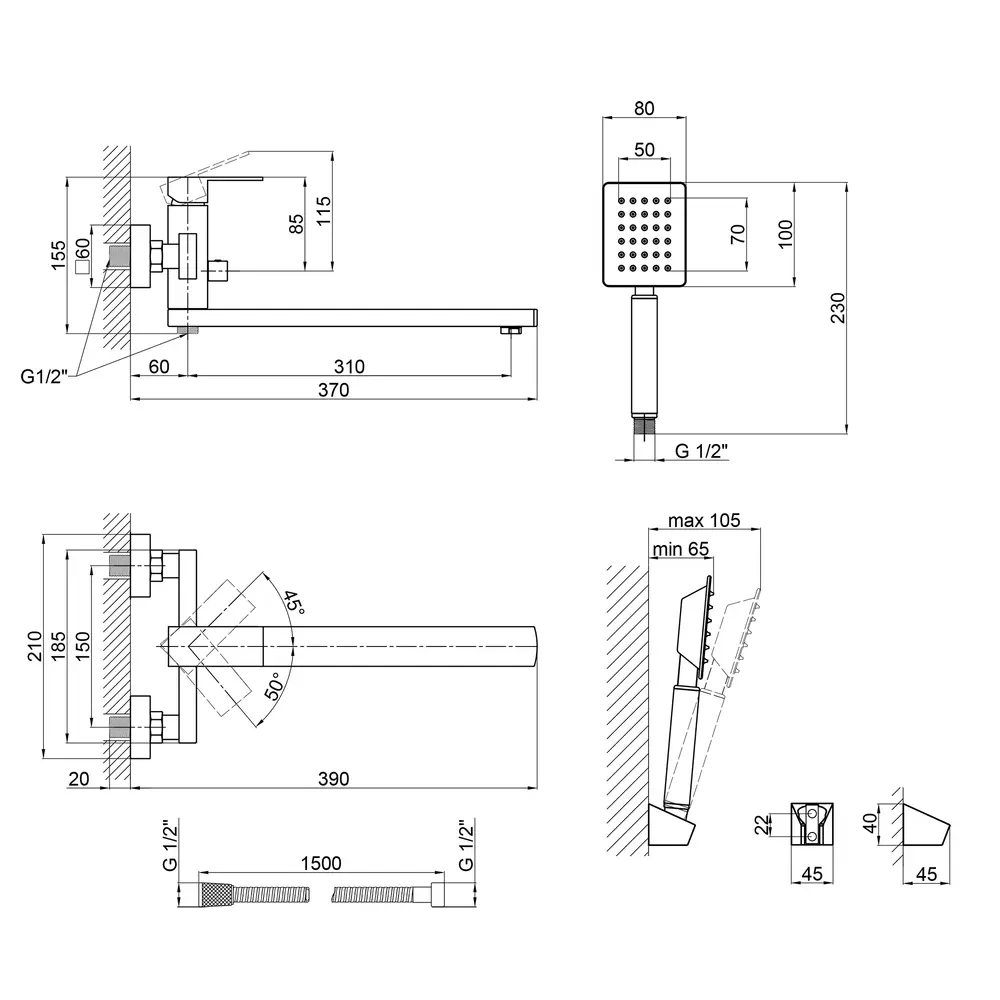 Смеситель, Кронштейн для ручного душу, Лійка для ручного душу, Душовий шланг, Кріплення