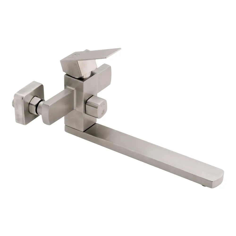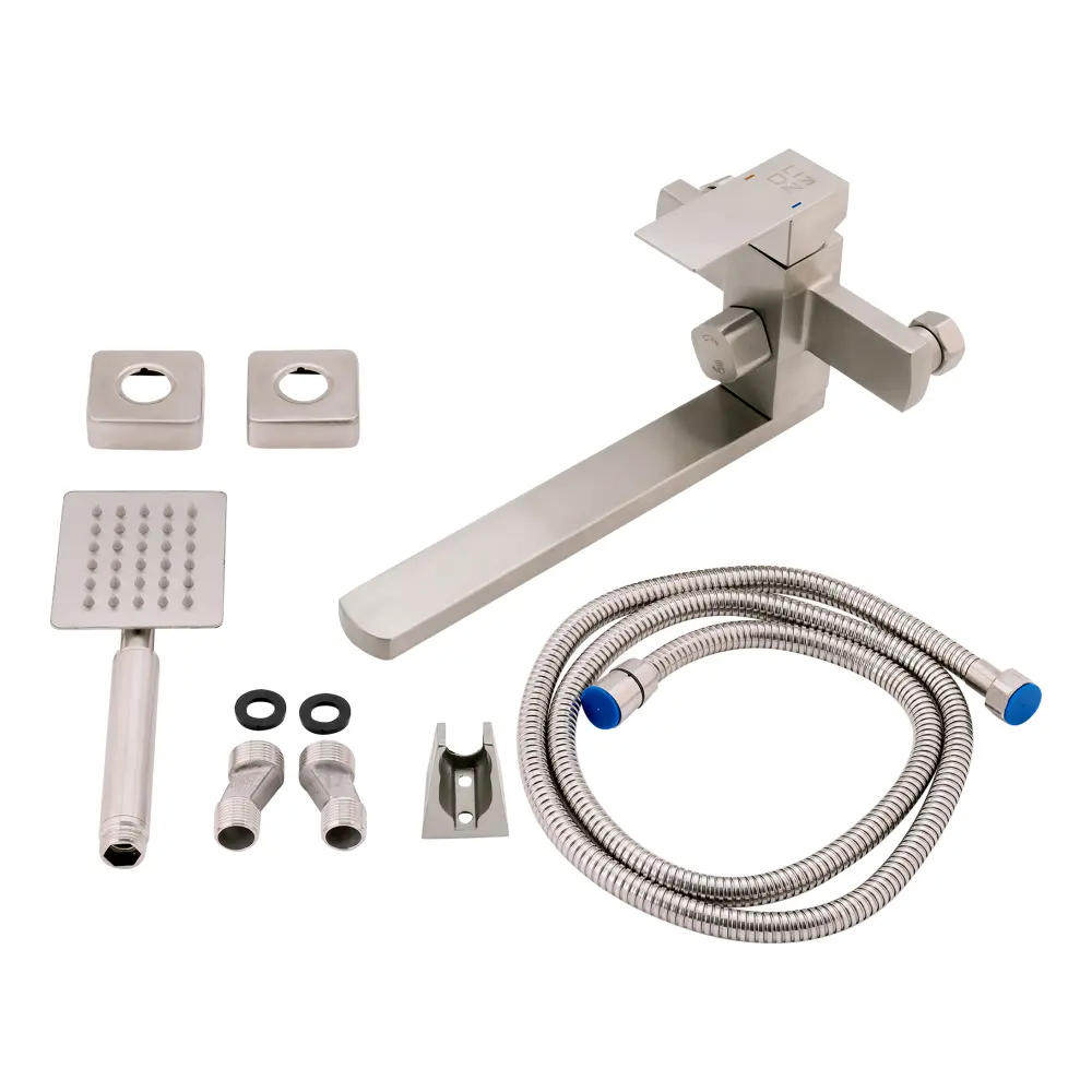 Смеситель для ванны Lidz (NKS) 10 30 005-1 выполнен в кубическом стиле из нержавеющей стали, что гарантирует длительный срок эксплуатации. Для включения подачи воды достаточно поднять рычаг и повернуть его в необходимое положение. Смеситель монтируется на стену над ванной с помощью крепежных элементов, которые входят в комплект. Квадратные розетки скроют погрешности установки на отделке. Держатель лейки крепится также на стену. Таким образом, ваши руки будут свободны во время принятия душа.