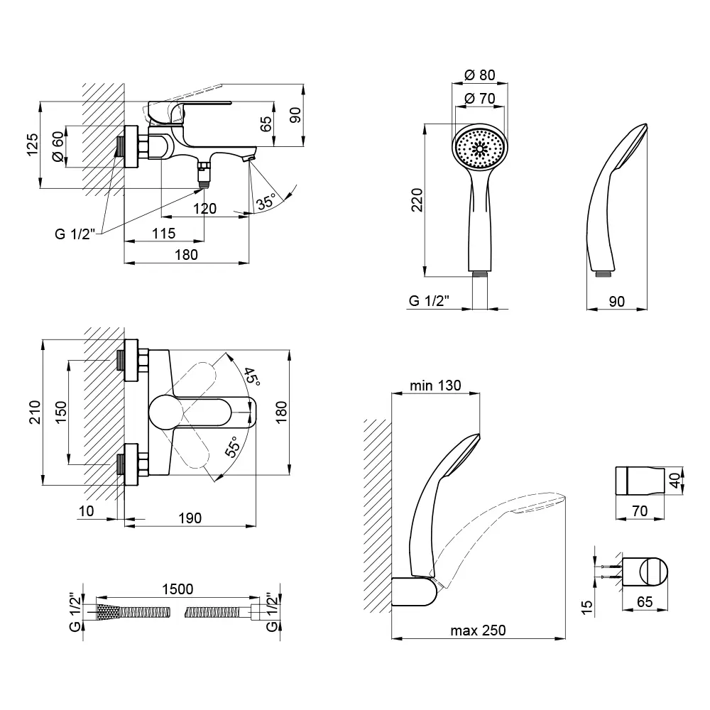 Змішувач, Лійка для ручного душу, Душовий шланг, Кронштейн для ручного душу, Кріпильні деталі
