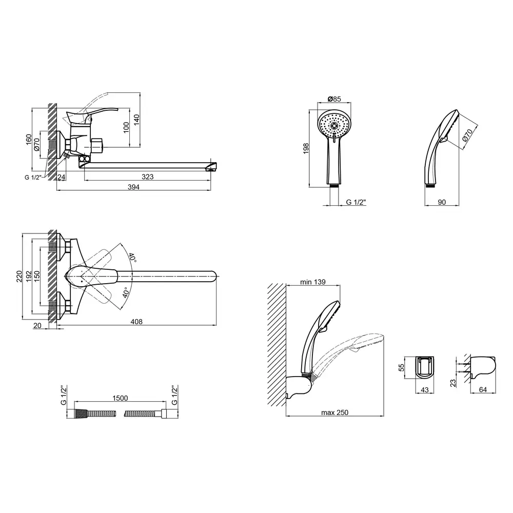 Змішувач, Лійка для ручного душу, Душовий шланг, Кронштейн для ручного душу, Кріпильні деталі