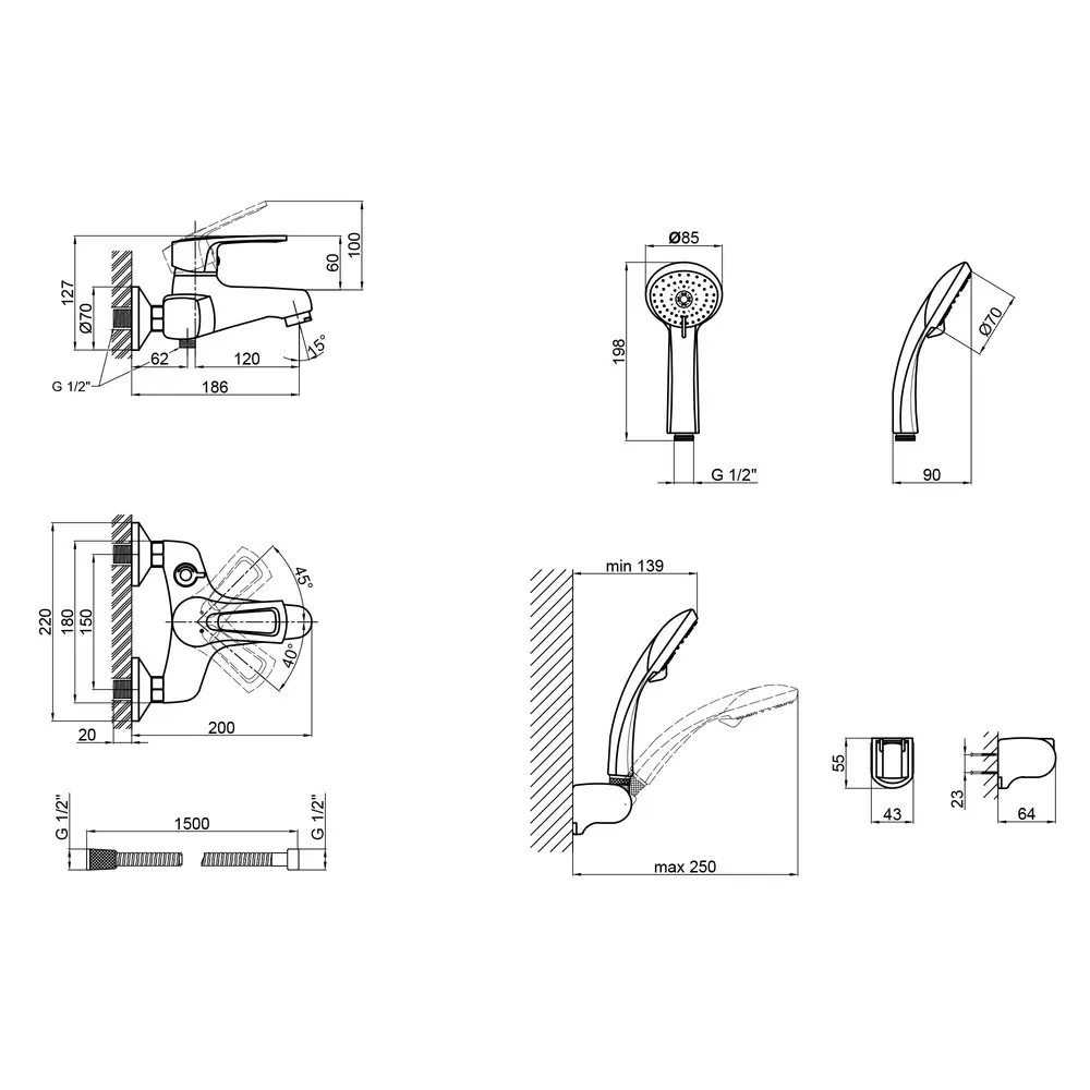 Змішувач, Лійка для ручного душу, Душовий шланг, Кронштейн для ручного душу, Кріпильні деталі