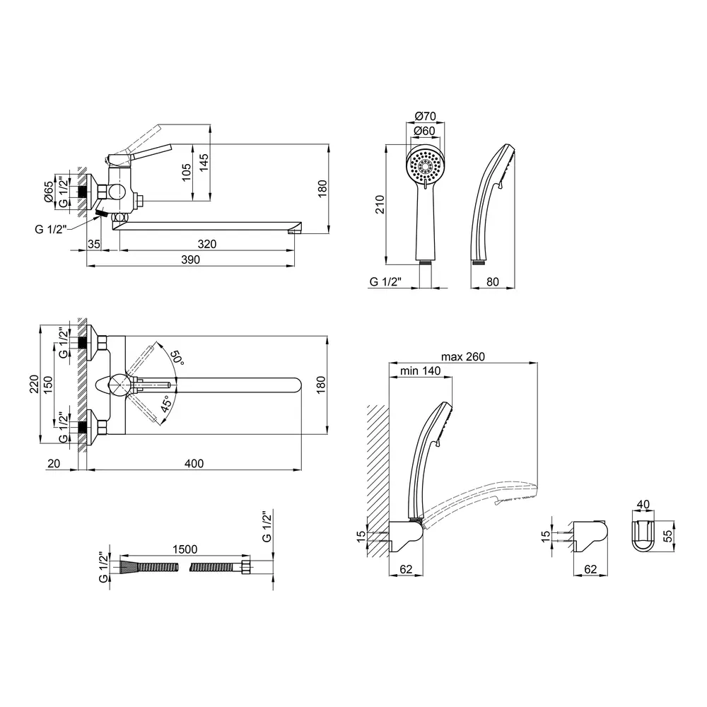 Змішувач, Лійка для ручного душу, Душовий шланг, Кронштейн для ручного душу, Кріпильні деталі