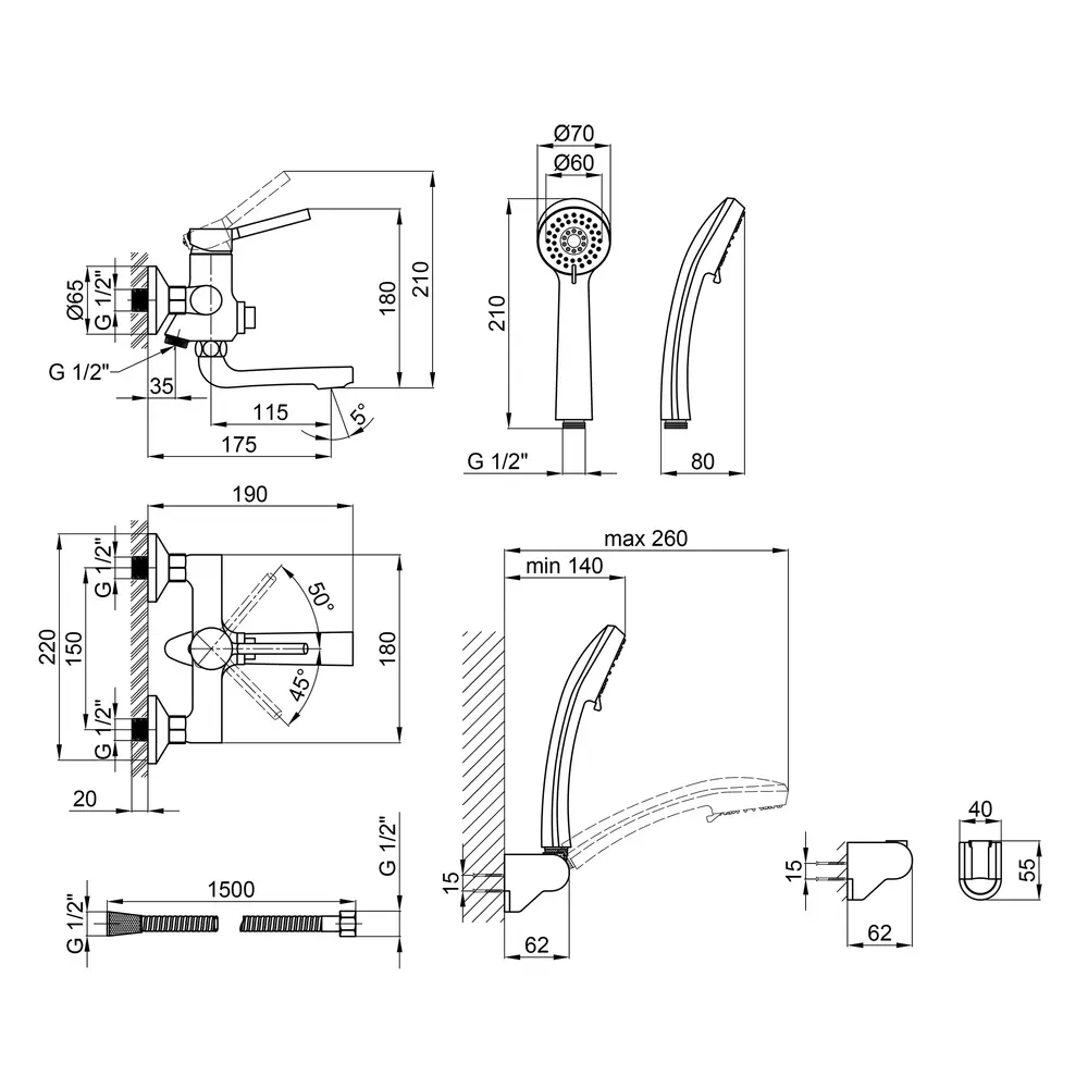 Змішувач, Лійка для ручного душу, Душовий шланг, Кронштейн для ручного душу, Кріпильні деталі