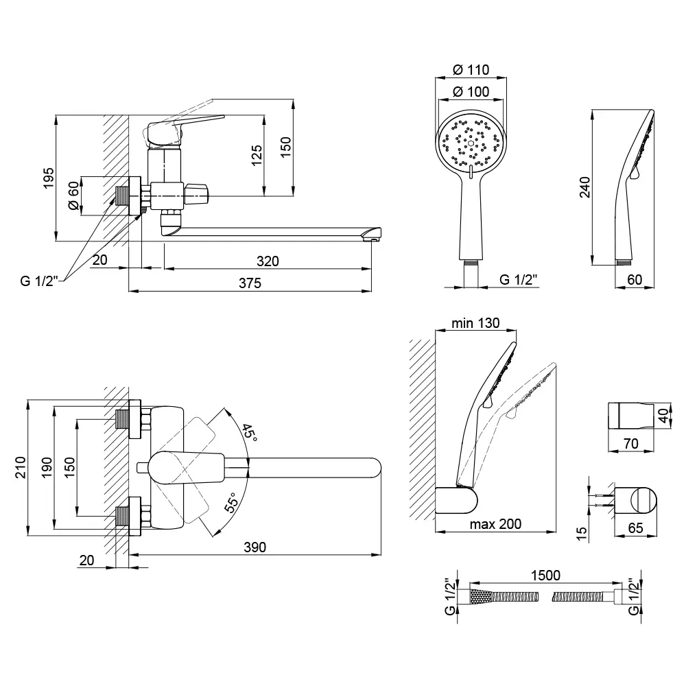 Змішувач, Лійка для ручного душу, Душовий шланг, Кронштейн для ручного душу, Кріпильні деталі