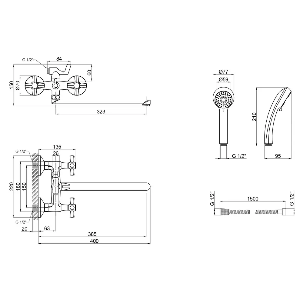 Змішувач, Душовий шланг, Лійка для ручного душу, Кріпильні деталі