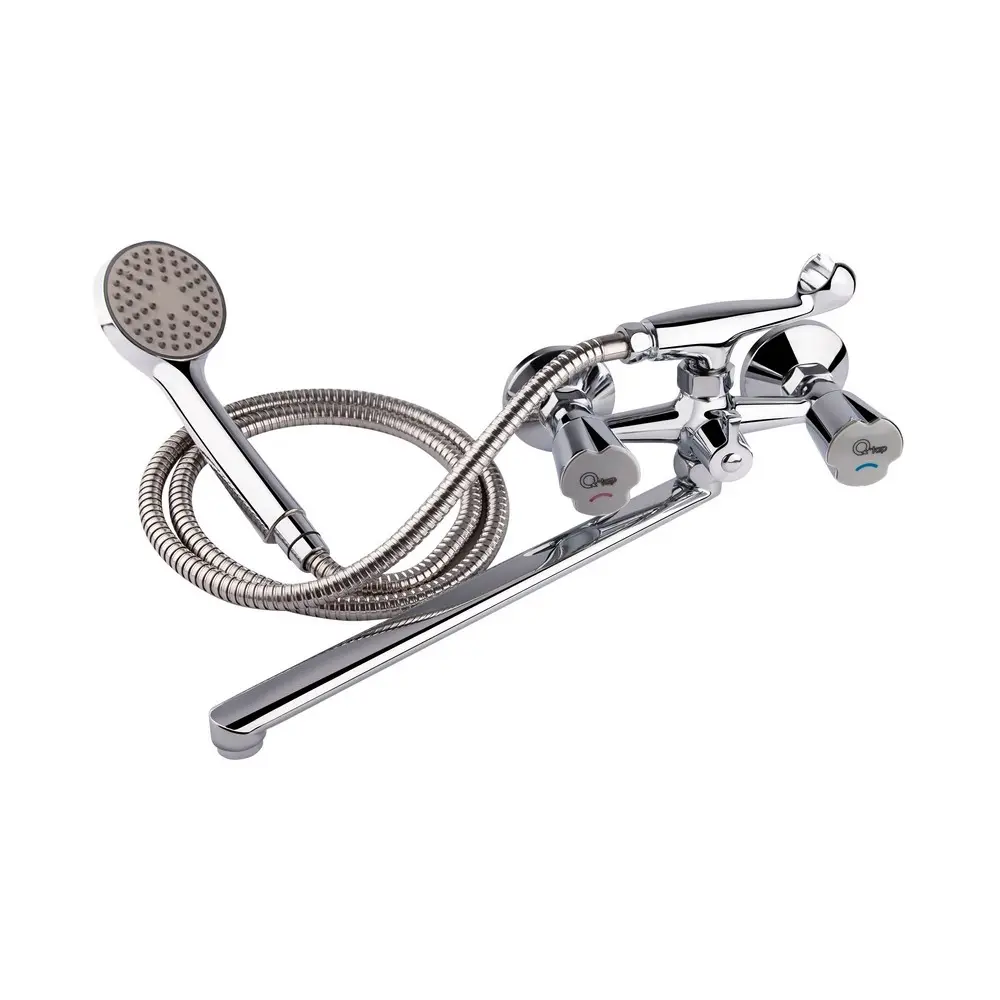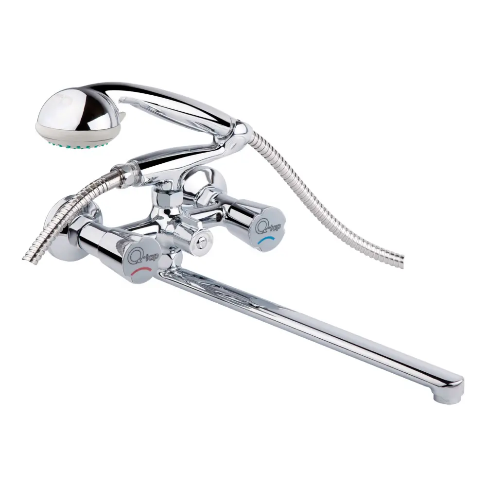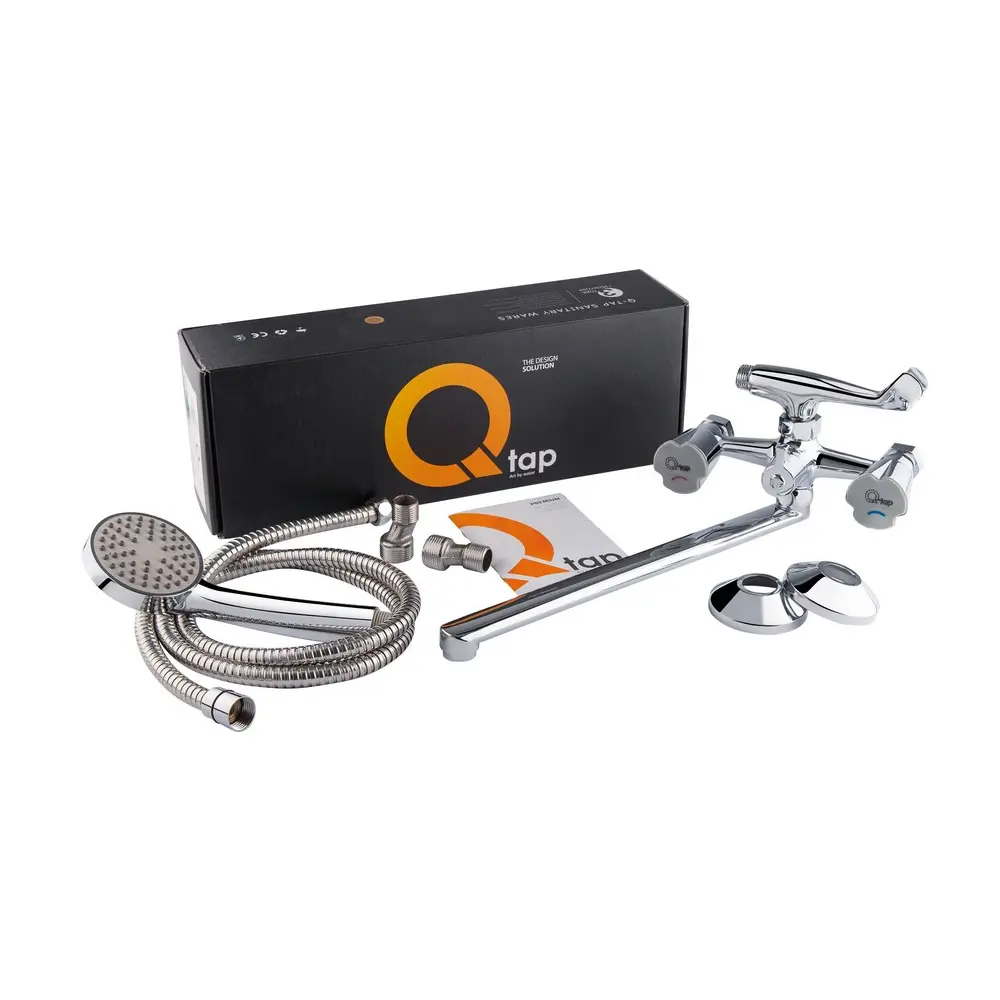Змішувач для ванни Qtap Mix CRM 140K з інтегрованим шланговим під‘єднанням виготовлений з міцної та зносостійкої латуні з рівномірним хромованим покриттям золотого кольору, завдяки якому виріб має привабливий зовнішній вигляд й більш стійкий до механічних пошкоджень. У комплекті є лійка та душовий шланг. Подача води здійснюється за допомогою зручних вентилів з маркуванням холодної та гарячої води, а перемикання на душовий режим - поворотним дивертором.