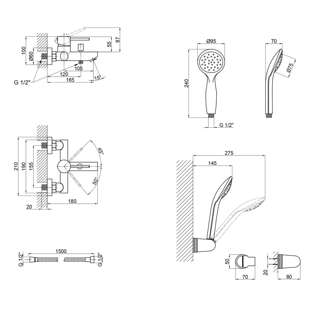 Змішувач, Лійка для ручного душу, Душовий шланг, Кронштейн для ручного душу, Кріпильні деталі