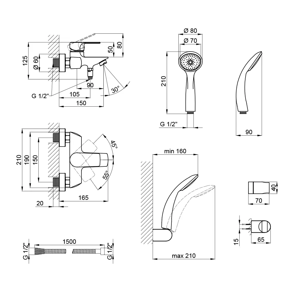 Змішувач, Лійка для ручного душу, Душовий шланг, Кронштейн для ручного душу, Кріпильні деталі