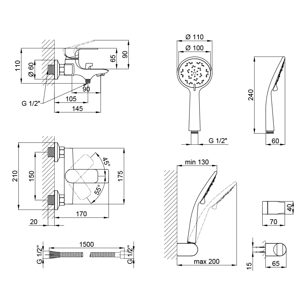 Змішувач, Лійка для ручного душу, Душовий шланг, Кронштейн для ручного душу, Кріпильні деталі