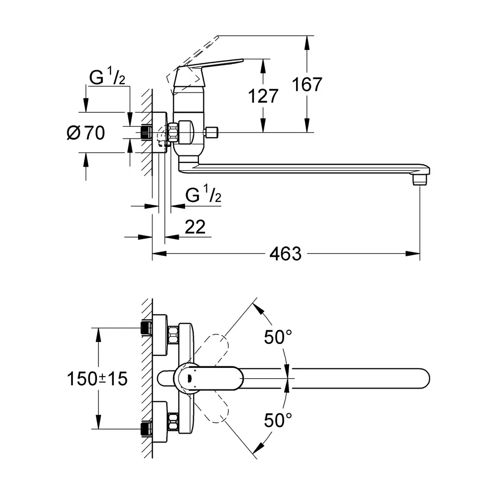 Металевий важіль. Регулювання витрати води. Мінімальна витрата води: ? 2.5 л/хв. Автоматичний перемикач: ванна/душ. Вилив, що обертається. S-подібні сполуки. GROHE SilkMove 46 мм керамічний картридж,
