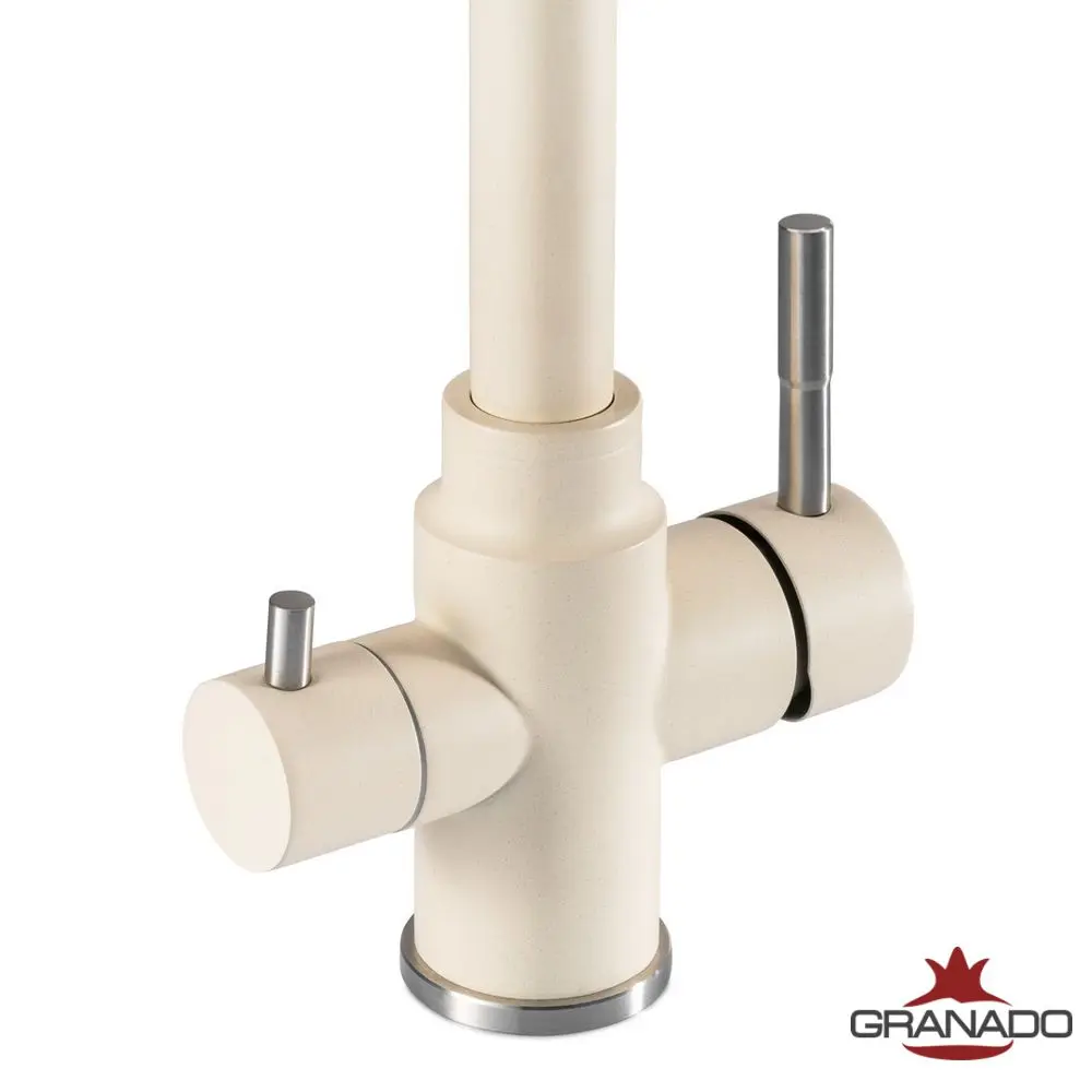 Змішувач для мийки GRANADO Badalona - функціональне рішення для сучасної кухні. Висота 33 см дозволяє безпроблемно помити габаритний посуд. Вода не забризкує ані стіну, ані сушильне крило мийки, ані підлогу. Поворотний змішувач забезпечує можливість комфортно користуватися мийкою з двома чашами.