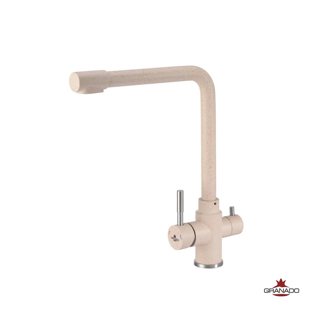 Змішувач для мийки GRANADO Badalona - функціональне рішення для сучасної кухні. Висота 33 см дозволяє безпроблемно помити габаритний посуд. Вода не забризкує ані стіну, ані сушильне крило мийки, ані підлогу. Поворотний змішувач забезпечує можливість комфортно користуватися мийкою з двома чашами.