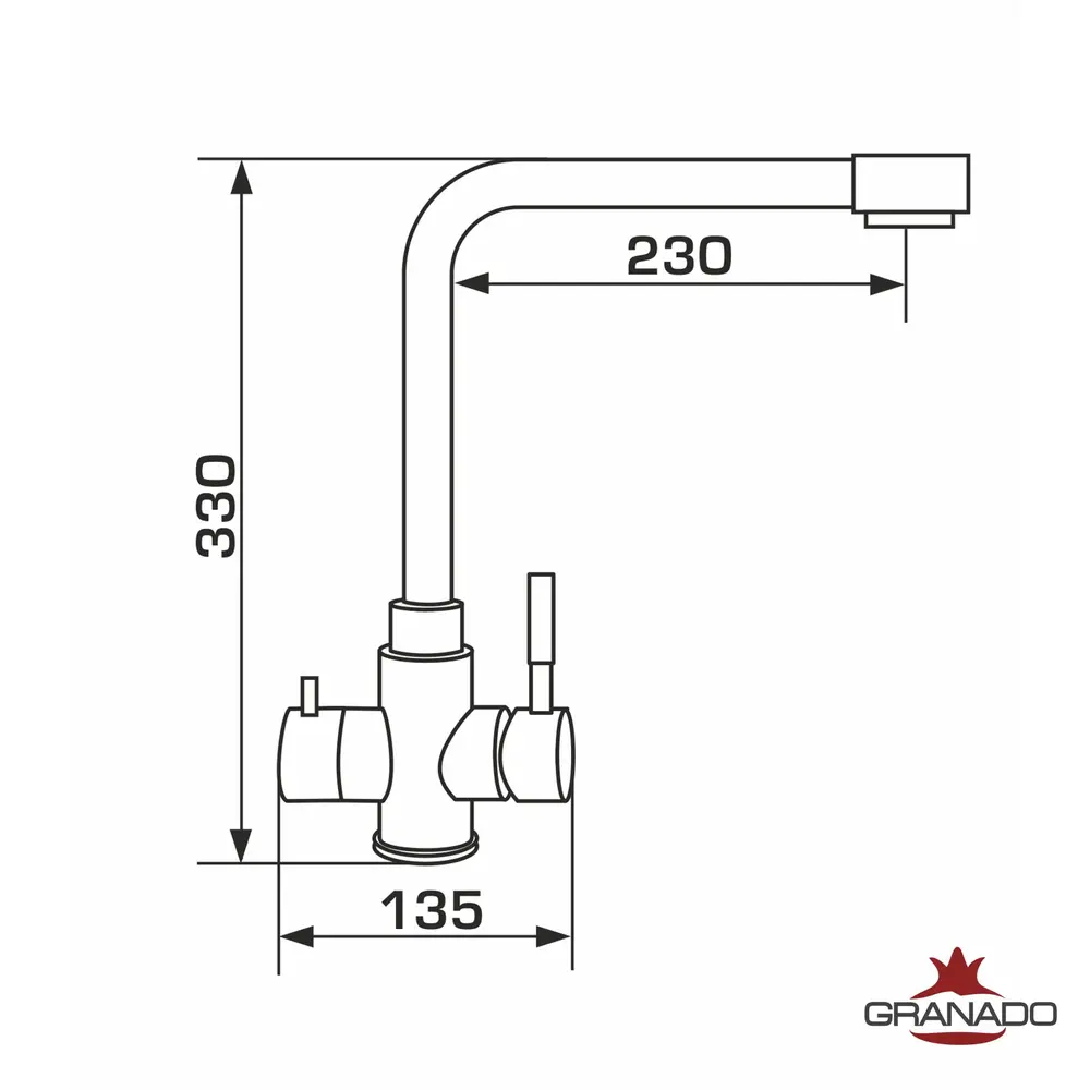 Змішувач для мийки GRANADO Badalona - функціональне рішення для сучасної кухні. Висота 33 см дозволяє безпроблемно помити габаритний посуд. Вода не забризкує ані стіну, ані сушильне крило мийки, ані підлогу. Поворотний змішувач забезпечує можливість комфортно користуватися мийкою з двома чашами.