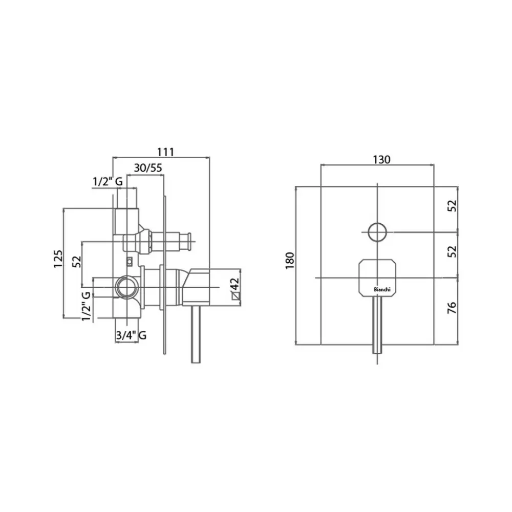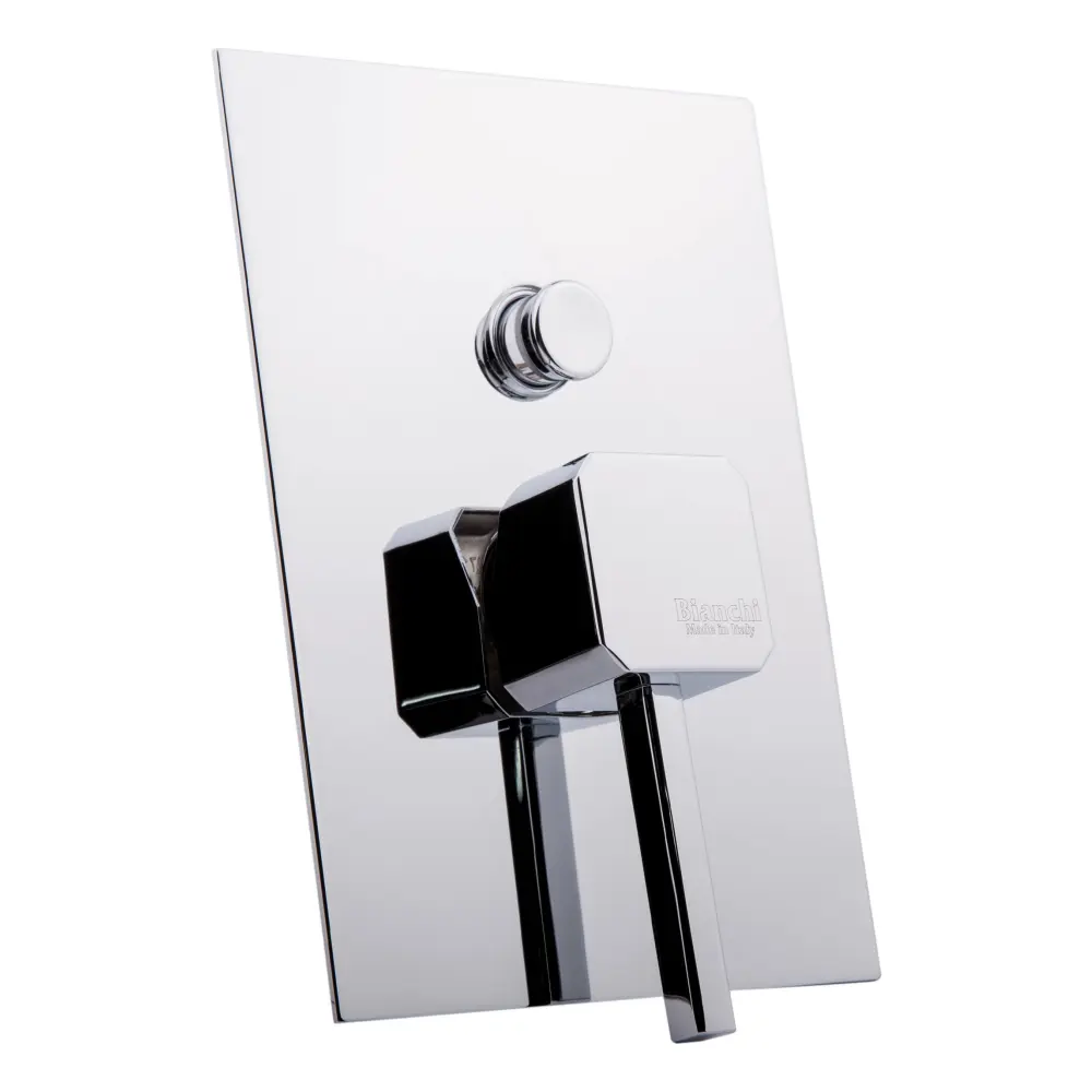 Змішувач прихованого монтажу на два споживача для душу Bianchi Kubik INDKBK2010CRM додасть розкішного вигляду інтер‘єру ванної кімнати, а міцна хромована поверхня збереже зовнішній вигляд змішувача на довгі роки. Він складається з: зовнішньої частини у вигляді накладної панелі з важелем і перемиканням на споживача та внутрішньої з механізмом змішування води. Зовнішня частина виготовлена з високоякісної латуні, яка стійка до впливу корозії.