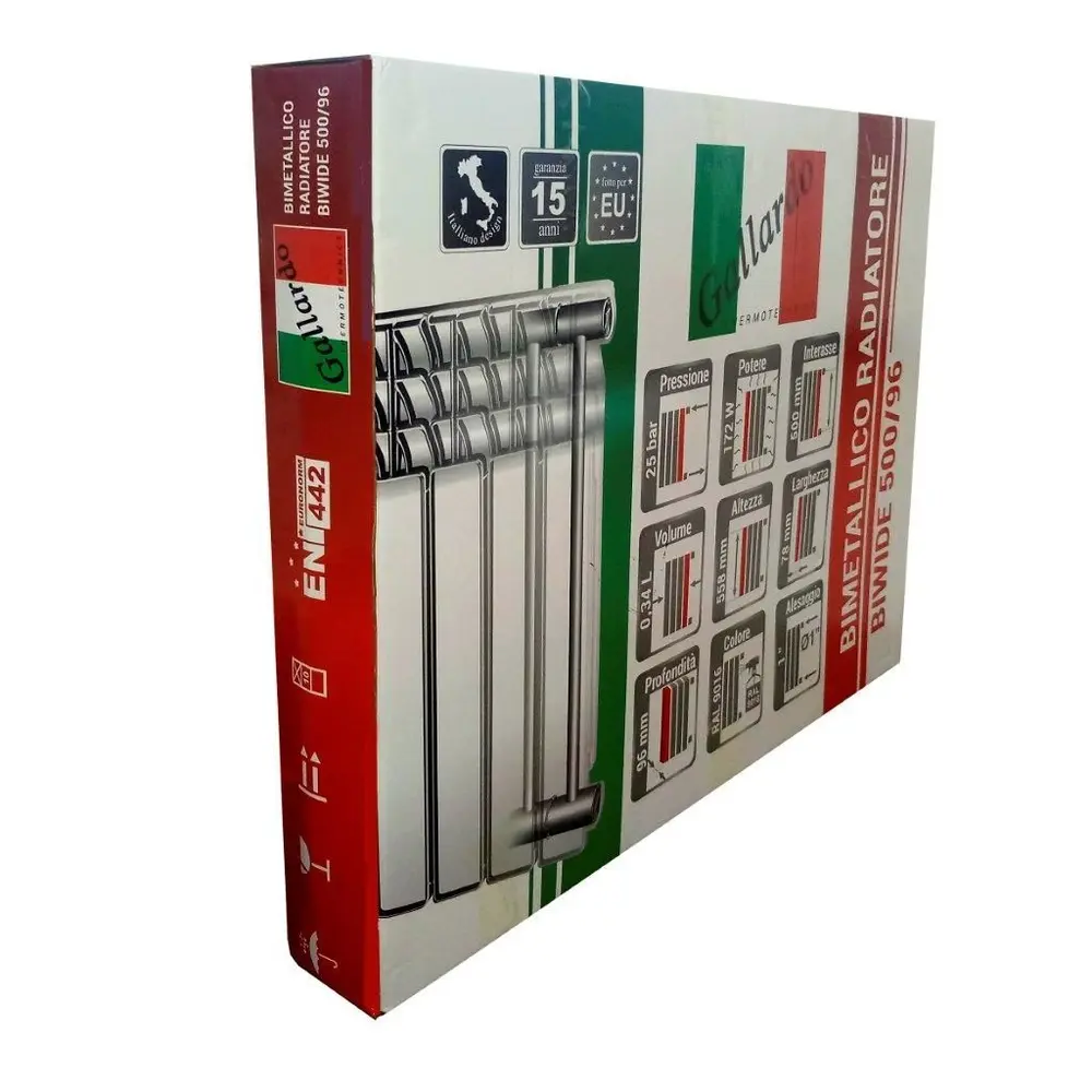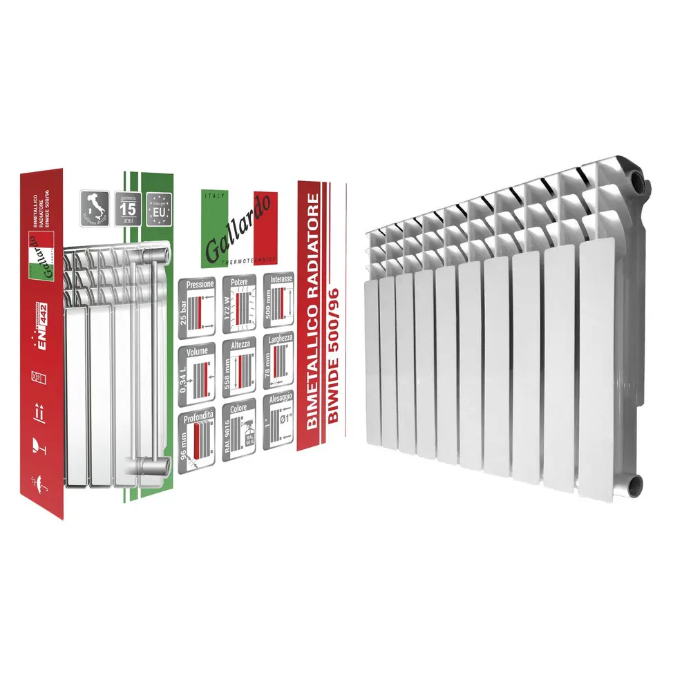 Біметалічні радіатори GALLARDO мають внутрішній сердечник з високоякісної сталі з товщиною вертикальних стінок 2.2мм і трубки колекторів - 3,6 мм, що підвищує корозійну стійкість і міцність радіатора. Батареї проходять випробувальний тиск 40 атм.