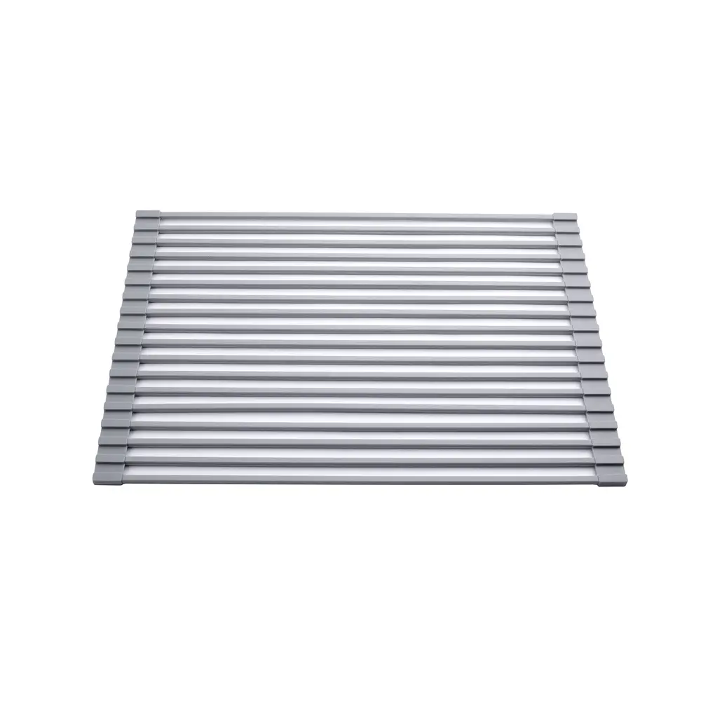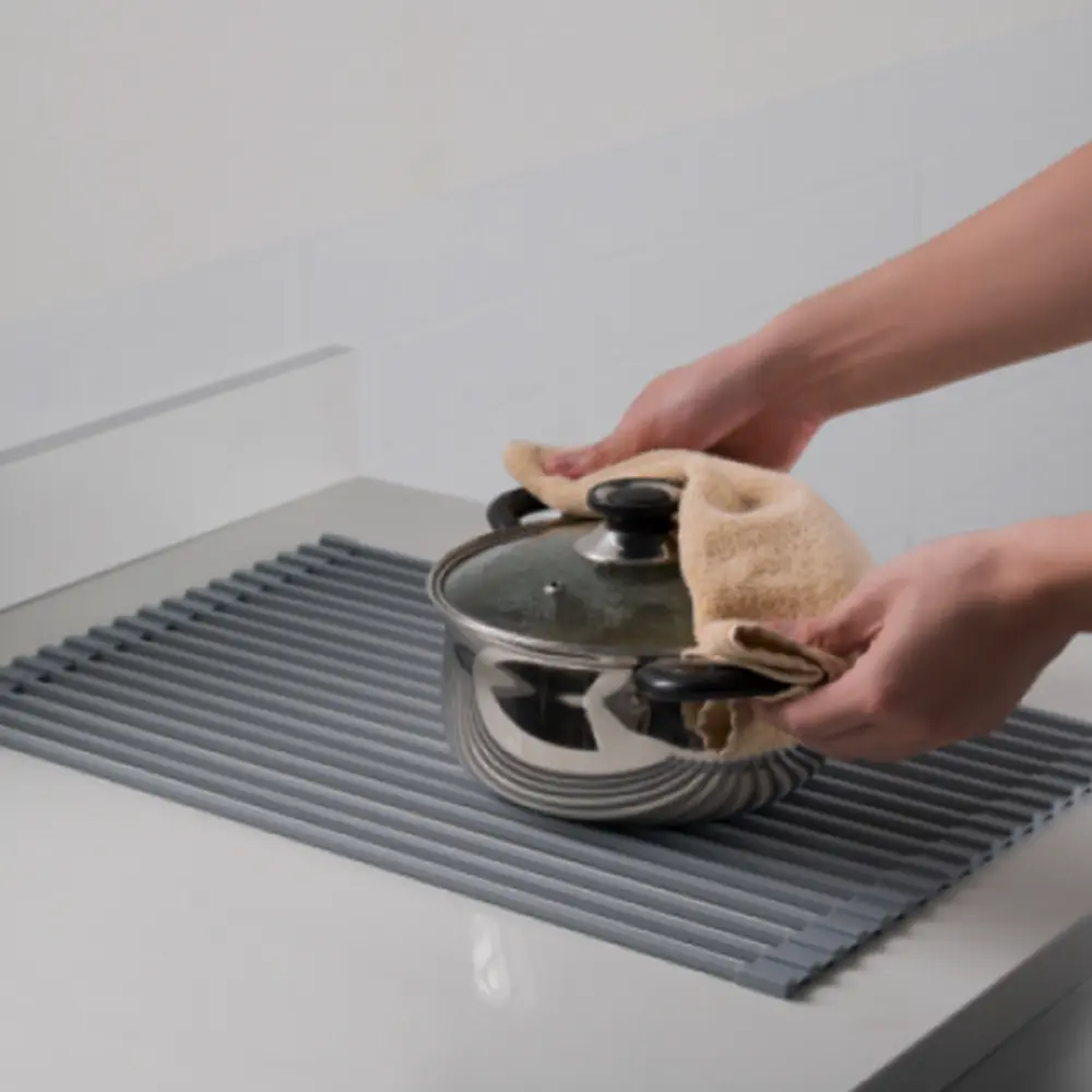 Сушилка-коврик для посуды Kroner KRP Matte-GRA4331-1 выполнена из пищевого силикона и нержавеющей стали. Сушка такого типа называется трофлексом, устанавливается поверх мойки или на столешницу. Важным преимуществом этого типа сушки является то, что она всегда под рукой и на нее можно складывать не только посуду, но, например, и мытые овощи, а так же возможно использовать для размещения горячих кастрюль и сковородок. Сушка скатывается в рулон и не занимает много места, а при необходимости быстро раскладывается для сушки посуды или овощей.