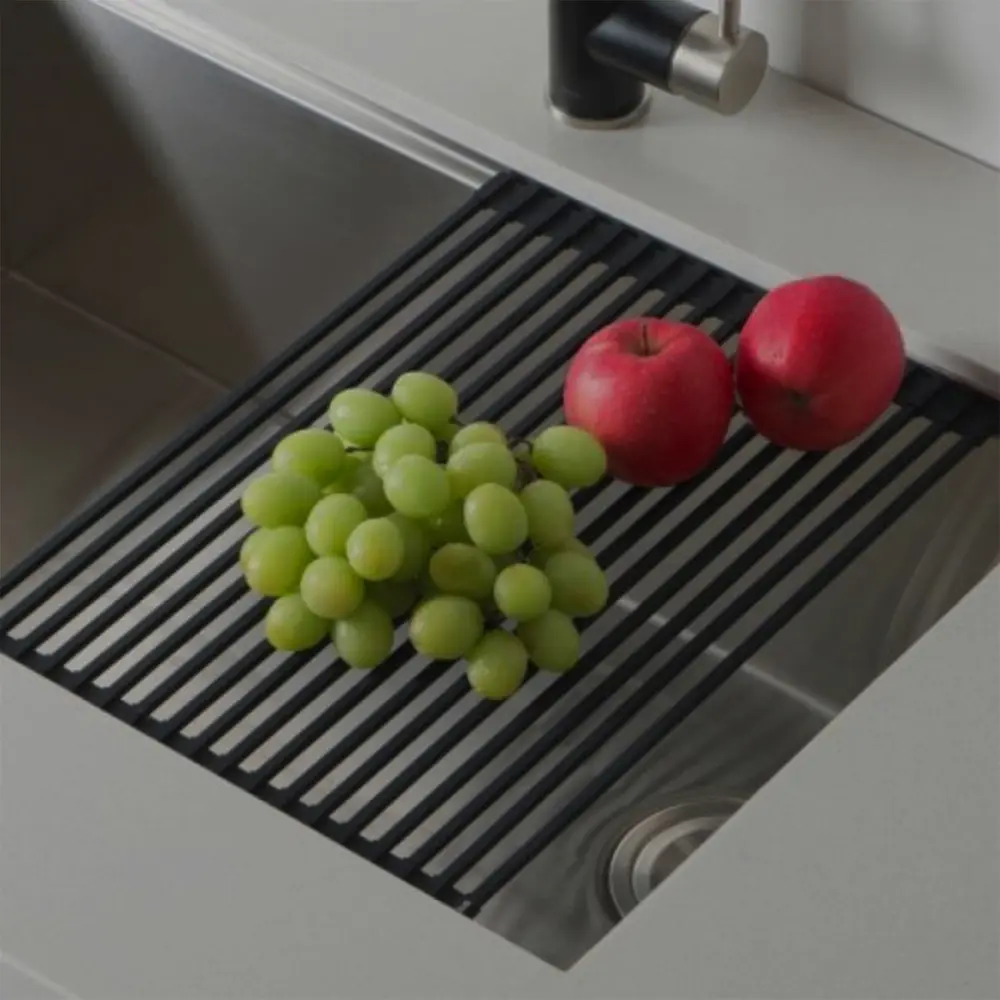 Сушилка-коврик для посуды Kroner KRP Matte-SCH4331-1 выполнена из пищевого силикона и нержавеющей стали. Сушка такого типа называется трофлексом, устанавливается поверх мойки или на столешницу. Важным преимуществом этого типа сушки является то, что она всегда под рукой и на нее можно складывать не только посуду, но, например, и мытые овощи, а так же возможно использовать для размещения горячих кастрюль и сковородок. Сушка скатывается в рулон и не занимает много места, а при необходимости быстро раскладывается для сушки посуды или овощей.