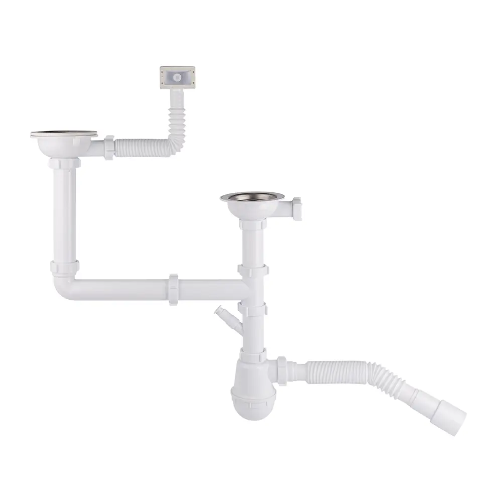 Сифон для кухонної мийки з двома чашами Krono Plast ЕМ2550EURO виконаний з пластику з двома зливними отворами на різних рівнях. Таким чином, виріб не піддається корозії, скупченню жиру і бруду на гладких внутрішніх стінках, не дає каналізації засмічуватися: резервуар колби відкручується для очищення від твердих частинок. До переваг даної моделі варто також віднести наявність підмикання до побутових приладів і переливу, який убезпечить вас від небажаного виходу води за край мийки.