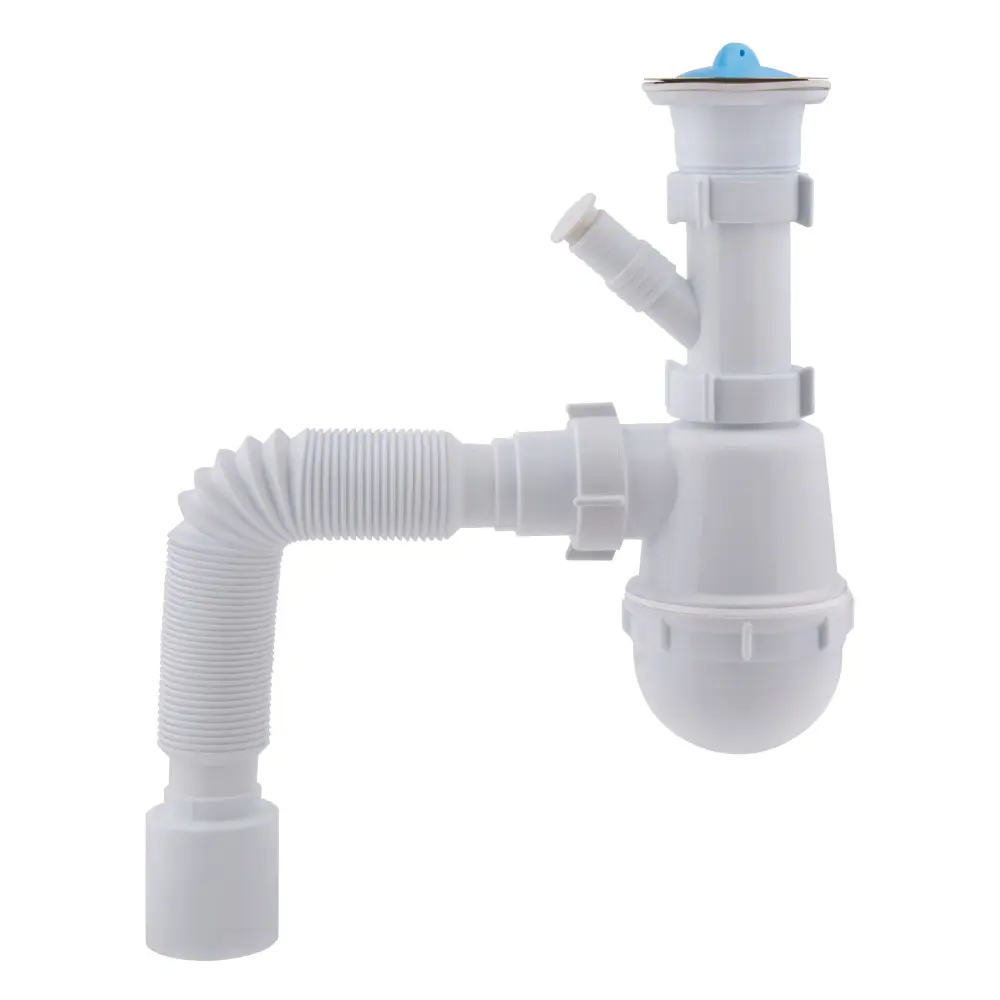 Сифон для кухонної мийки Krono Plast М1550 виконаний з пластику в білому класичному кольорі зі склянкою-колбою і металевою решіткою. Таким чином, виріб не піддається корозії, скупченню жиру і бруду на гладких внутрішніх стінках, не дає каналізації засмічуватися: резервуар сифона відкручується для очищення від твердих частинок. До переваг даної моделі також слід віднести наявність підмикання до побутових приладів і переливу для запобігання небажаного виходу води за край мийки.