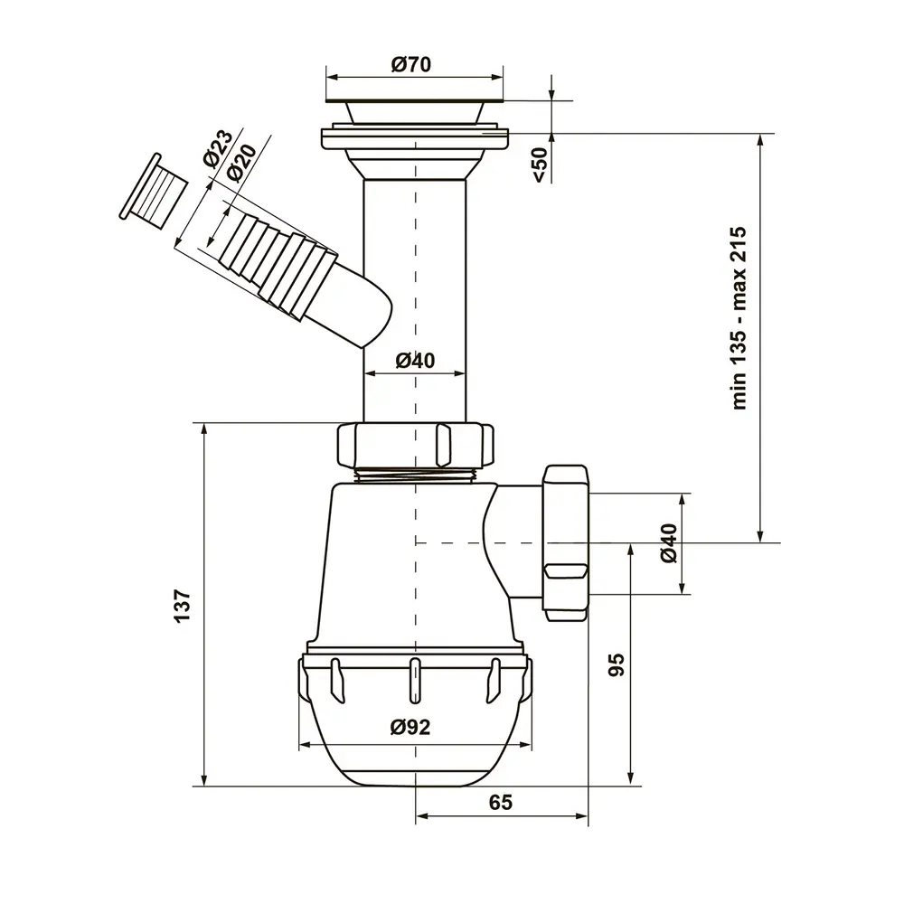Сифон з литим випуском та відведенням для підключення пральної машини. Якщо відведення для пральної машини не використовується, то для його надійного закриття використовують поліпропіленову пробку, що йде в комплекті. Сітка випуску, гвинт і гайка з нержавіючої сталі.
