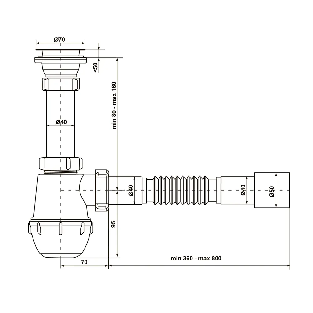 Сифон зі збільшеним корпусом та різьбовим випуском. Для підключення до каналізації комплектується гнучкою трубою. Сітка, гвинт і гайка з нержавіючої сталі.
