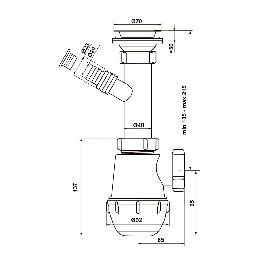 Сифон із різьбовим випуском, з відведенням для підключення пральної машини. Якщо відведення для пральної машини не використовується, то для його надійного закриття використовують поліпропіленову пробку яка йде в комплекті. Сітка випуску, гвинт та гайка з нержавіючої сталі.