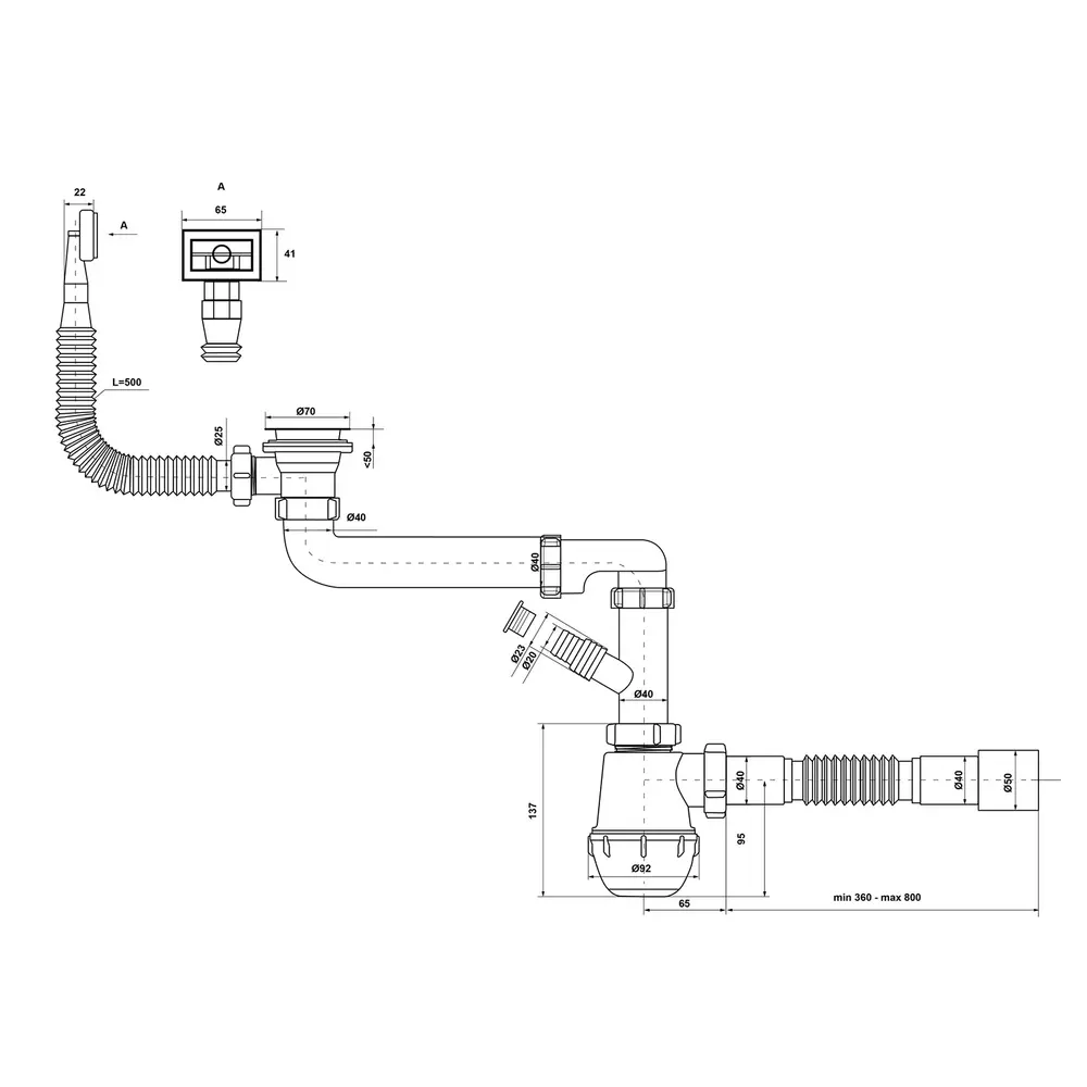 Сифон, гнучкий прямокутний перелив, відведення для підключення пральної машини, гофротруба