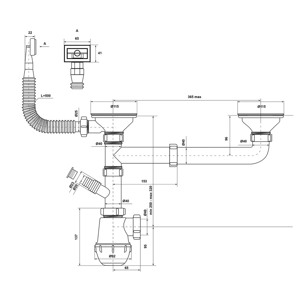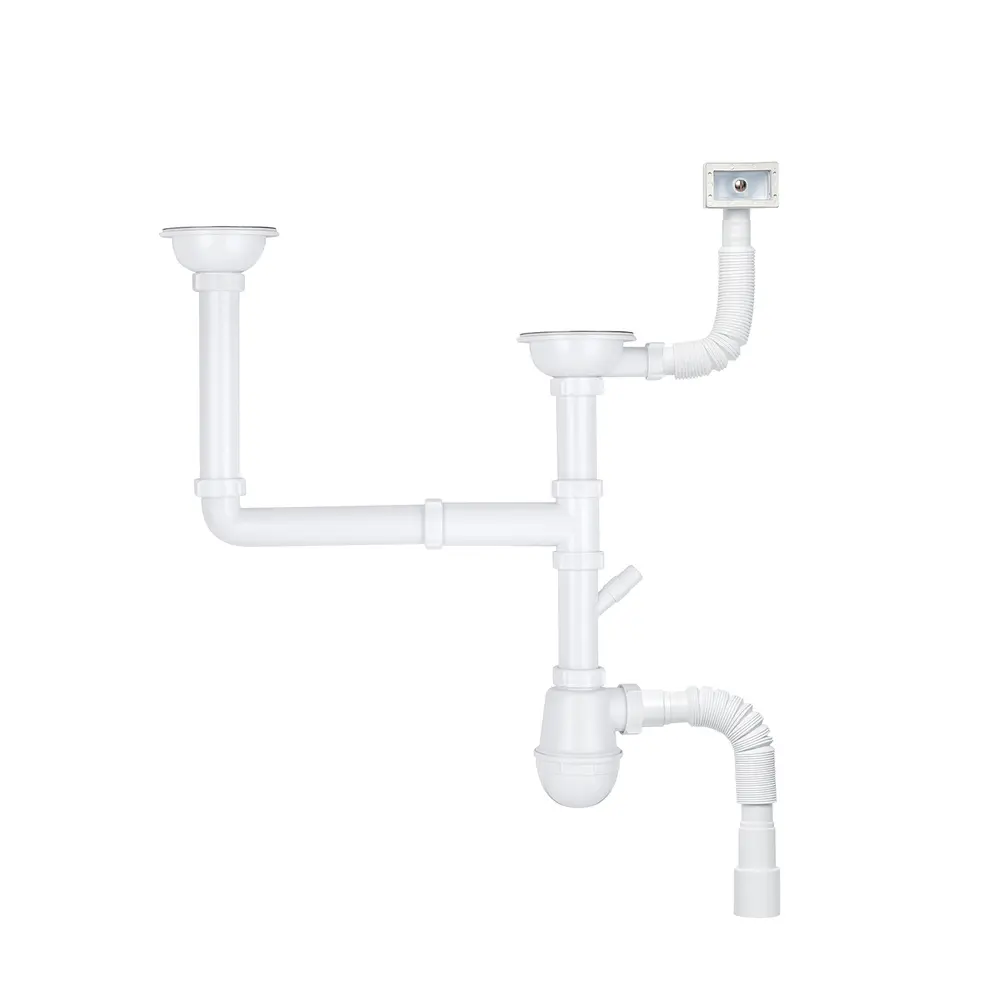 Сифон з двома розташованими зі зміщенням на одному рівні різьбовими випусками, з відведенням для підключення пральної машини, з прямокутним гнучким переливом. Прокладка прямокутного переливу є універсальною і дозволяє встановлювати перелив на мийки круглої і прямокутної форми, для цього необхідно перевернути прокладку і вставити в посадочне місце корпусу переливу потрібною стороною. Якщо відведення для пральної машини не використовується, то для його надійного закриття використовують поліпропіленову пробку яка йде в комплекті. Сітки випуску, гвинти і гайки з нержавіючої сталі.
