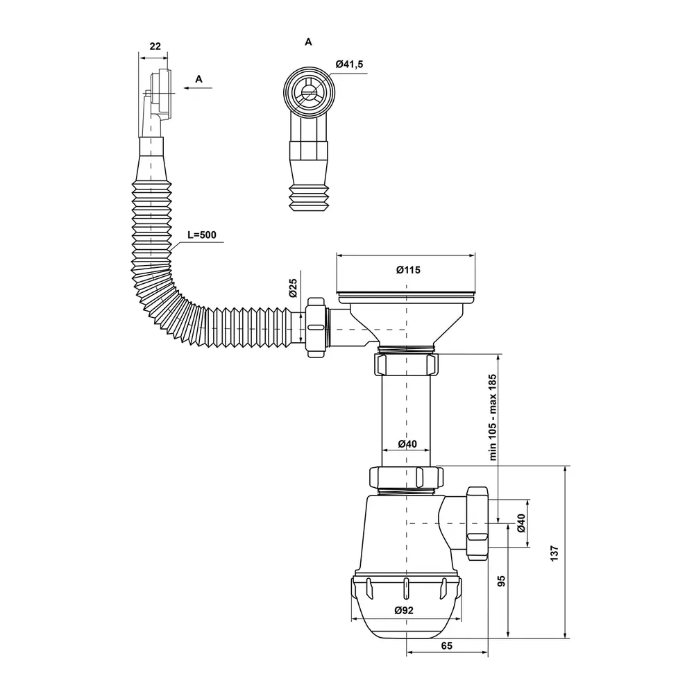 Сифон, з різьбовим випуском, з гнучким круглим переливом. Сітка випуску, гвинт і гайка з нержавіючої сталі.