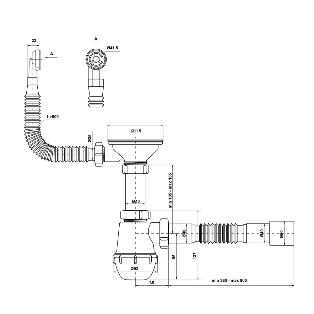 Сифон з різьбовим випуском та з гнучким круглим переливом. Для підключення до каналізації комплектується гофротрубою. Сітка, гвинт і гайка з нержавіючої сталі.