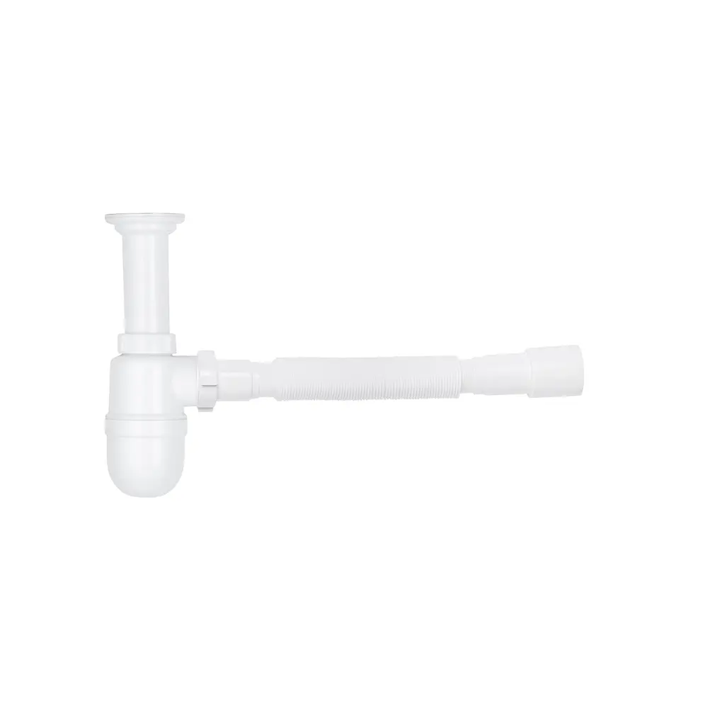 Сифон з литим випуском та гнучкою трубою. Сітка випуску виготовлена з нержавіючої сталі.