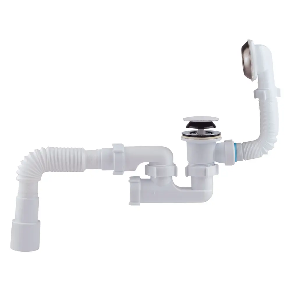 Сифон для ванни з переливом Krono Plast В0550К виконаний з пластику в класичному білому кольорі, має гладку внутрішню поверхню, що не тільки робить його поцінним, але й перешкоджає накопиченню бруду на стінках. Виріб не зазнає впливу корозії, не дає каналізації засмічуватися, а, у разі потреби його очистити, внизу коліна передбачено отвір-ревізію. Для закриття/відкриття зливного отвору досить натиснути на клапан один або два рази. Гофровані труби дають можливість змінювати їх довжину і кут.
