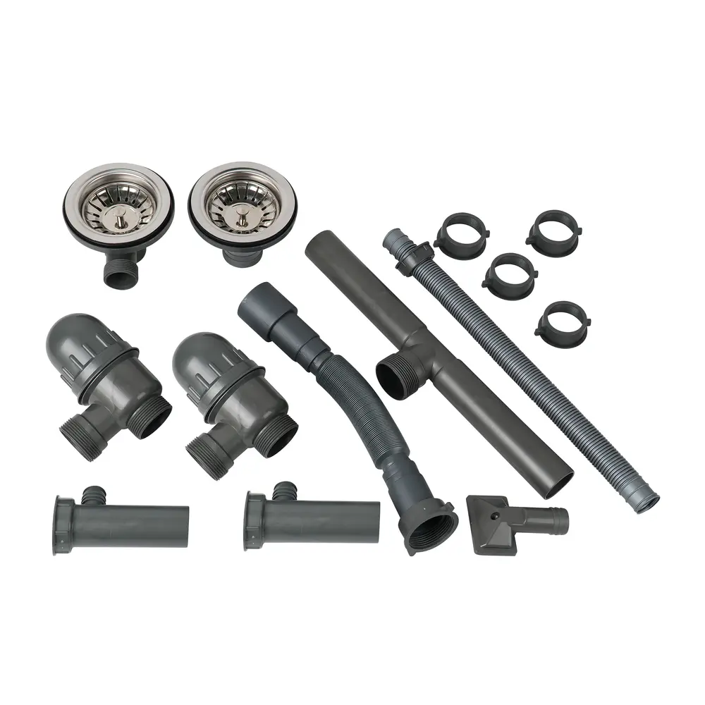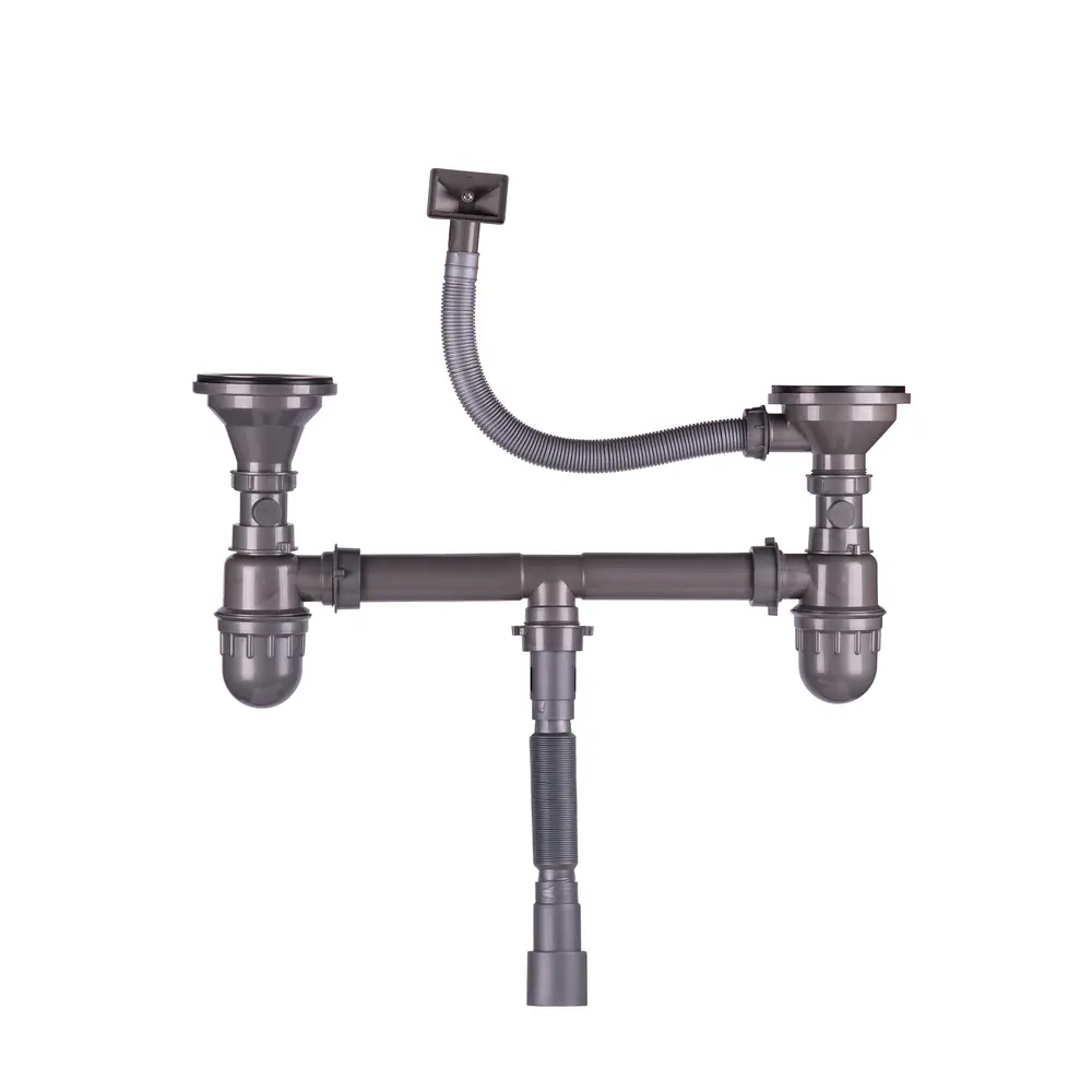 Сифон для подвійної кухонної мийки Lidz (GRA) 47 01 002 11 виконаний з пластика сірого кольору з двома зливними отворами. Виріб не піддається корозії, скупченню жиру і бруду на гладких внутрішніх стінках, не дає каналізації засмітяться: резервуари двох колб откручиваются для очищення від твердих частинок. Перевагами даної моделі слід відзначити наявність підключення до побутових приладів і переливу, який убезпечить вас від небажаного переповнення чаші раковини.