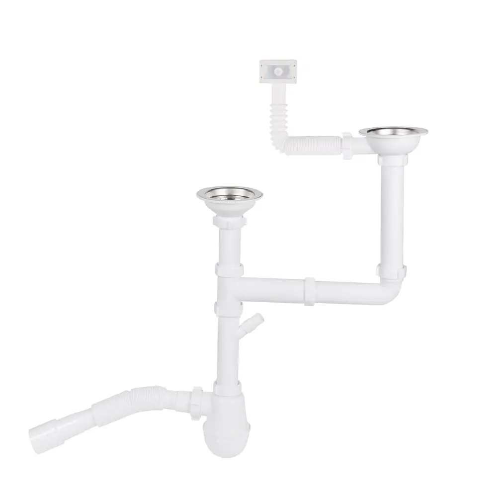 Сифон для подвійної кухонного миття Lidz (WHI) 60 05 M003 00 виготовлений з якісного пластика білого кольору. При необхідності резервуар сифона може відкручуватися для очищення. Гофрований вихід дає можливість змінювати довжину і кут труби. Завдяки комунікації для переливу можна уникнути переповнення кухонної раковини водою. Мокрий гідрозакрив забезпечить надійний захист від неприємних запахів з каналізації.