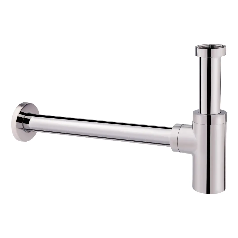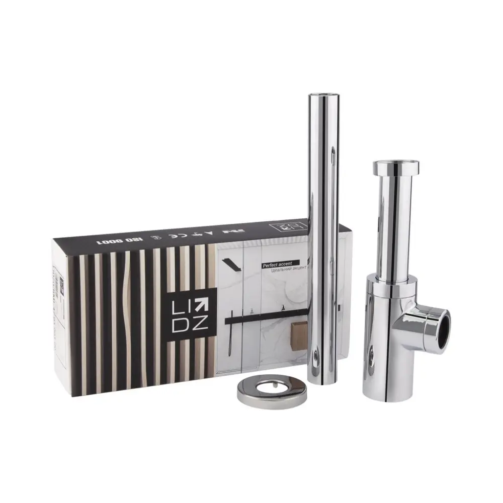 Сифон для раковини Lidz (CRM) 47 01 001 00 виконаний з металу з глянцевою хромованою поверхнею, яка стійка до утворення корозії і збереже свій блиск на довгі роки. Дана модель має привабливий естетичний вигляд, тому її немає сенсу ховати за панелями. Розетка приховає всі погрішності на обробці після установки. Мокрий гідрозатвор утворюється в циліндричної колбі. Він не пропускає неприємні запахи з каналізації в приміщення, а тверді частинки осідають на дні.