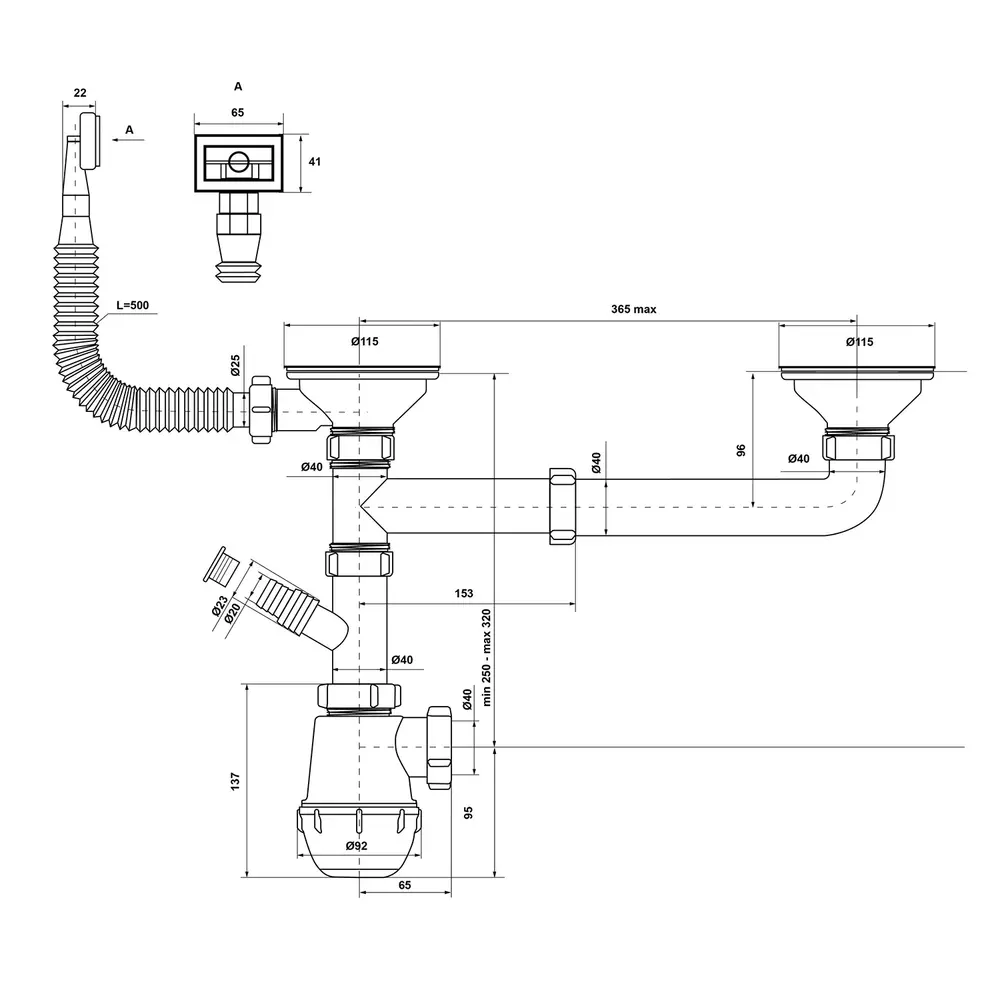 Сифон з двома розташованими зі зміщенням на одному рівні різьбовими випусками, з відведенням для підключення пральної машини, з прямокутним гнучким переливом. Прокладка прямокутного переливу є універсальною і дозволяє встановлювати перелив на мийки круглої і прямокутної форми, для цього необхідно перевернути прокладку і вставити в посадочне місце корпусу переливу потрібною стороною. Якщо відведення для пральної машини не використовується, то для його надійного закриття використовують поліпропіленову пробку яка йде в комплекті. Сітки випуску, гвинти і гайки з нержавіючої сталі.