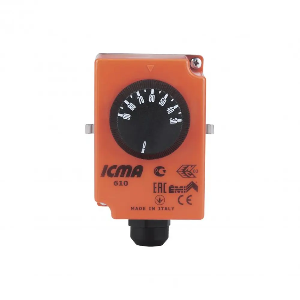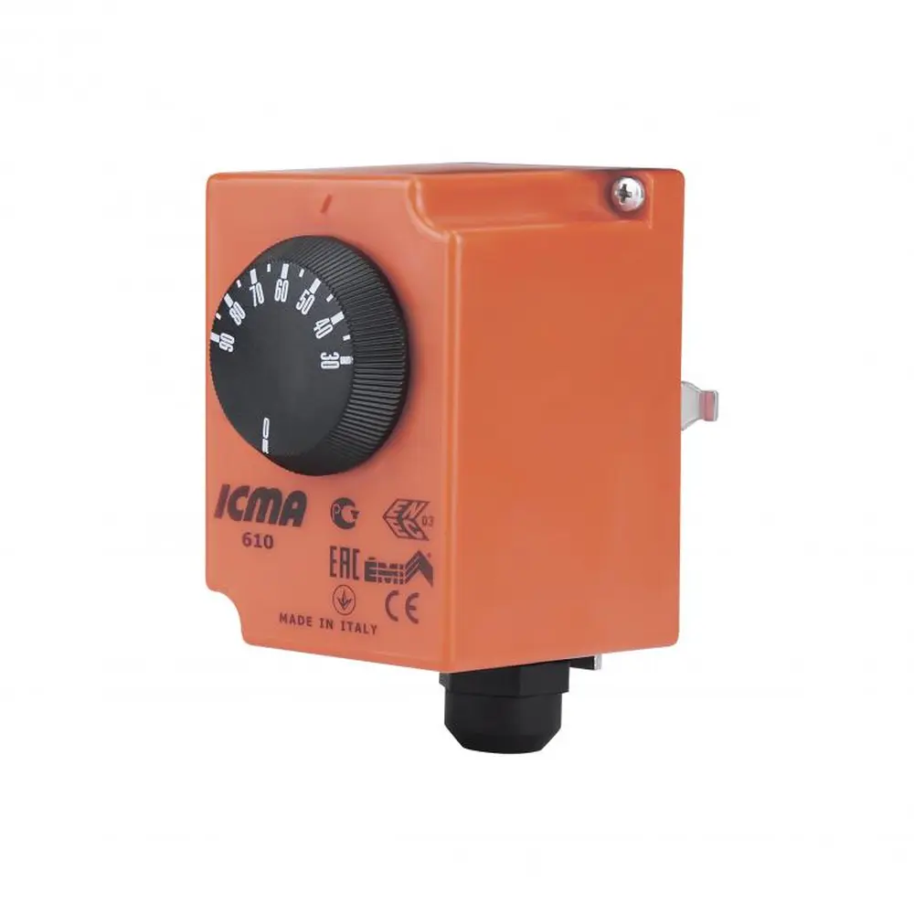 Термостати ICMA Арт. 610 призначені для подачі або зняття електричної напруги на елементи управління гідравлічних систем в залежності від зміни температури середовища. Термостати можуть управляти роботою насосів, пальників, сервоприводів змішувальних і запірних клапанів, автоматики, що сигналізує і т.п., за умови відповідності керованого агрегату технічним характеристикам термостата.